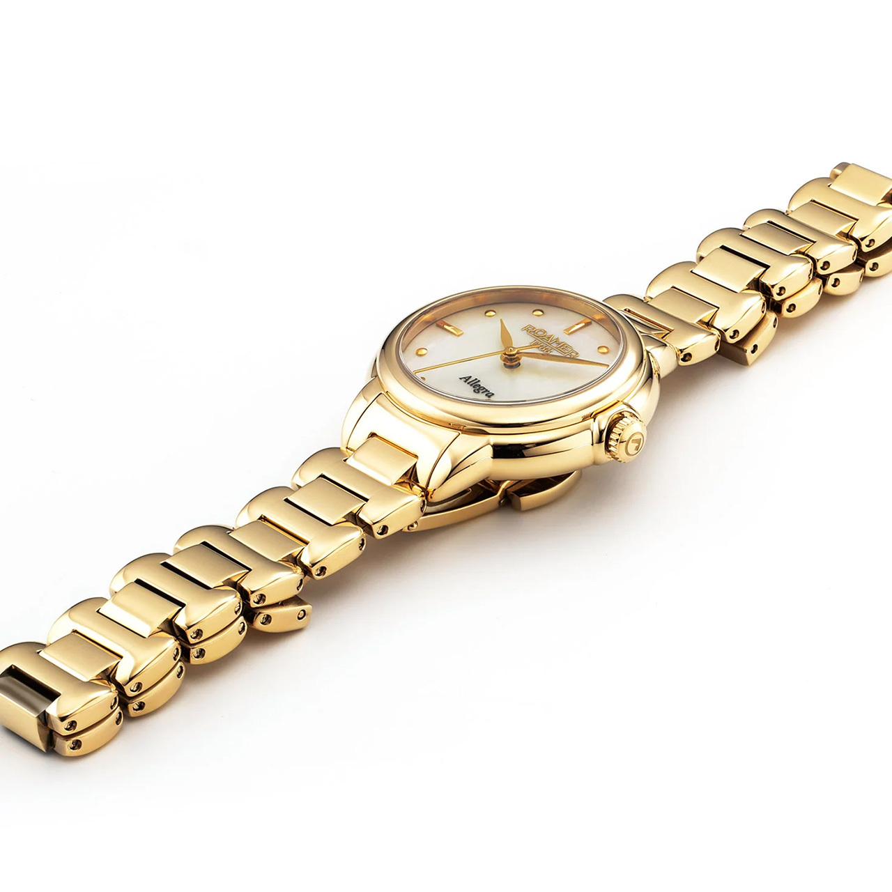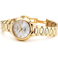 Корпус: Корпус выполнен из высококачественной нержавеющей стали 316L с IP покрытием из жёлтого золота. Перламутровый циферблат, позолоченные стрелки и часовые индексы. Сапфировое стекло с антибликовым покрытием. Рифленая заводная головка. Диаметр: 32 мм. Водонепроницаемость: 30 м.