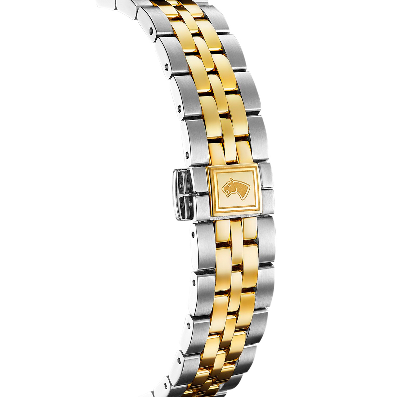 Ремешок: Интегрированный браслет на 5 звеньев с раскладывающейся застежкой-бабочкой. Частичное PVD-покрытие цвета желтого золота.