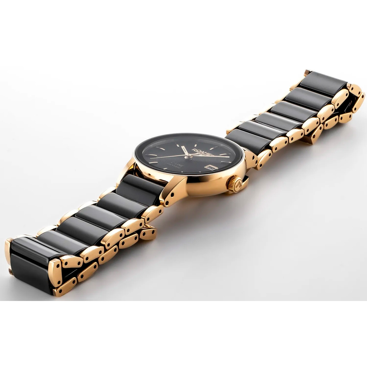 Ремешок: Часы оснащены металлическим браслетом с IP-покрытием и черными керамическими вставками. Браслетная застежка с тройным сложением – «бабочка».