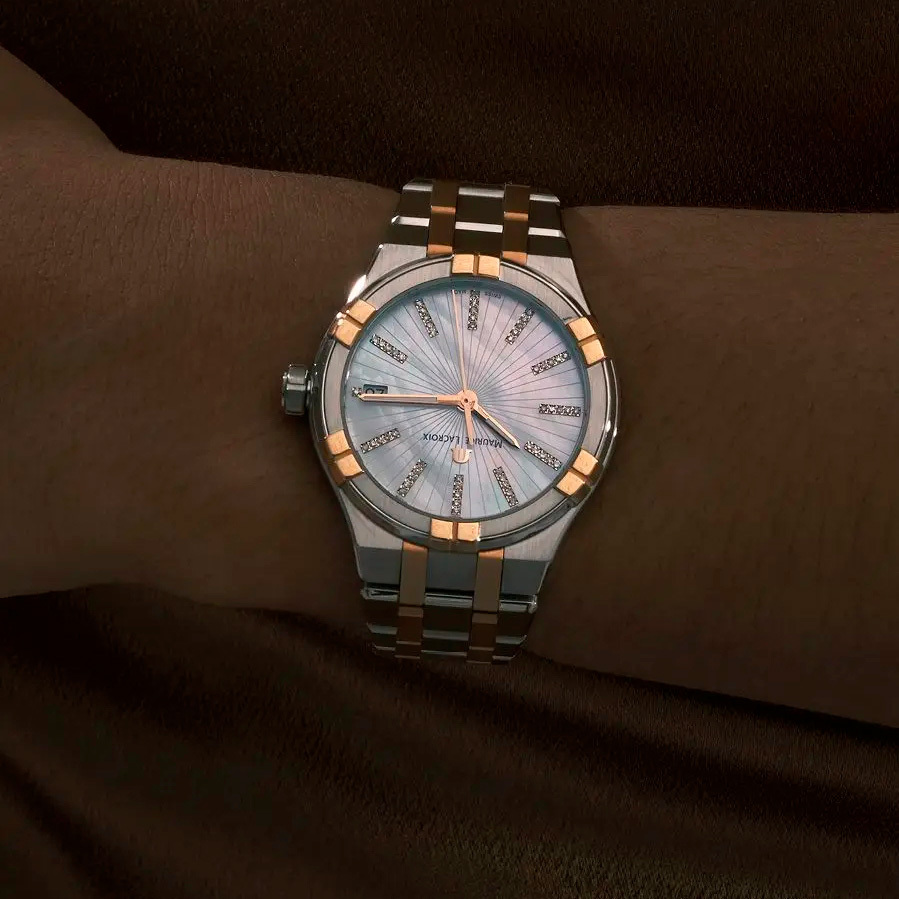 Ремешок: Модель поставляется с браслетом из нержавеющей стали с литыми звеньями в пять рядов, часть звеньев с позолотой, система быстрой замены ремешка/браслета, браслетная застежка с тройным сложением – «бабочка», раскладывающаяся при нажатии кнопок двойной блокировки, гравировка Maurice Lacroix.