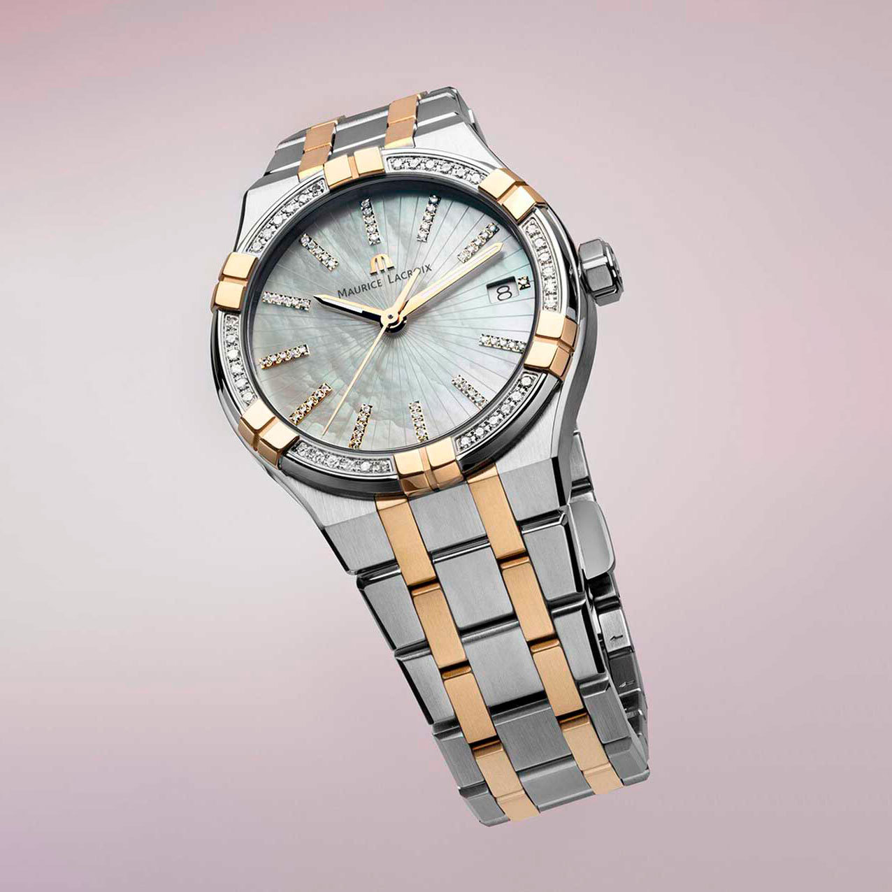 Ремешок: Браслет из нержавеющей стали с литыми звеньями в пять рядов, часть звеньев с позолотой, система быстрой замены ремешка/браслета, браслетная застежка с тройным сложением, раскладывающаяся при нажатии кнопок двойной блокировки, гравировка Maurice Lacroix.