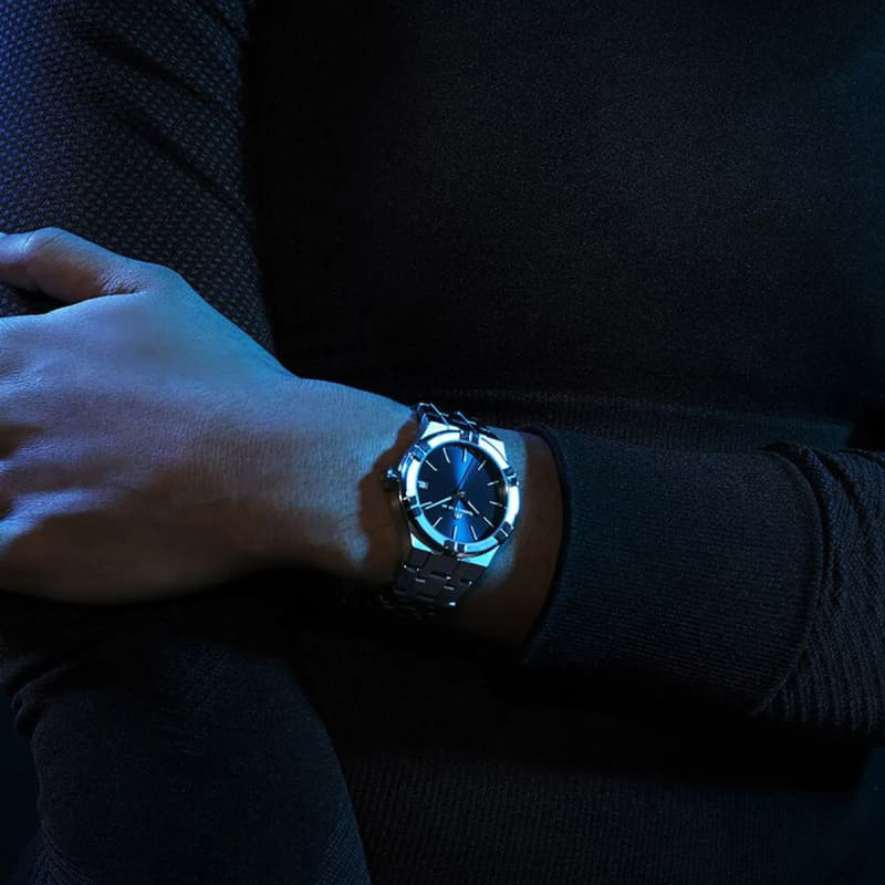 Корпус: Круглый корпус выполнен из нержавеющей стали, поверхности с матовой шлифовкой сатинированием и глянцевой полировкой. Циферблат глубокого синего цвета с шлифовкой "солнечные лучи". Аппликация часовых индексов и стрелки с алмазной огранкой имеют родиевое покрытие и полировку до зеркального блеска. Фотолюминесцентный состав SLN на стрелках, светящийся в темноте. Сапфировое стекло с антибликовым покрытием. Диаметр корпуса составляет 35 мм. Водостойкость 10 ATM.