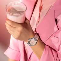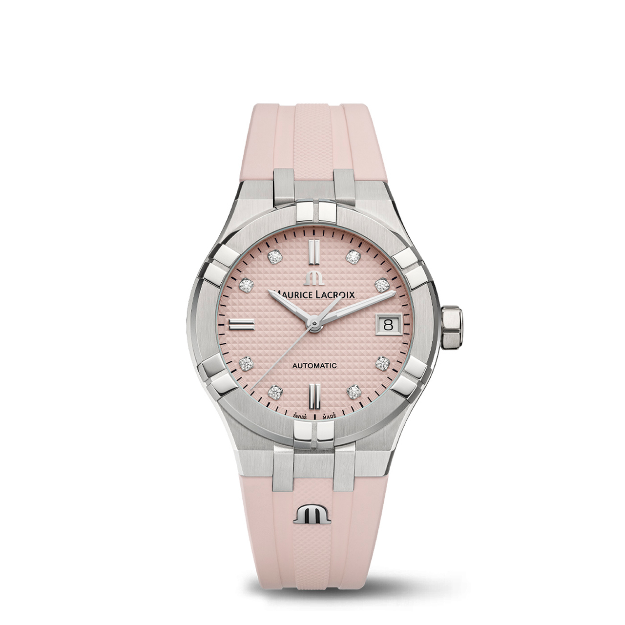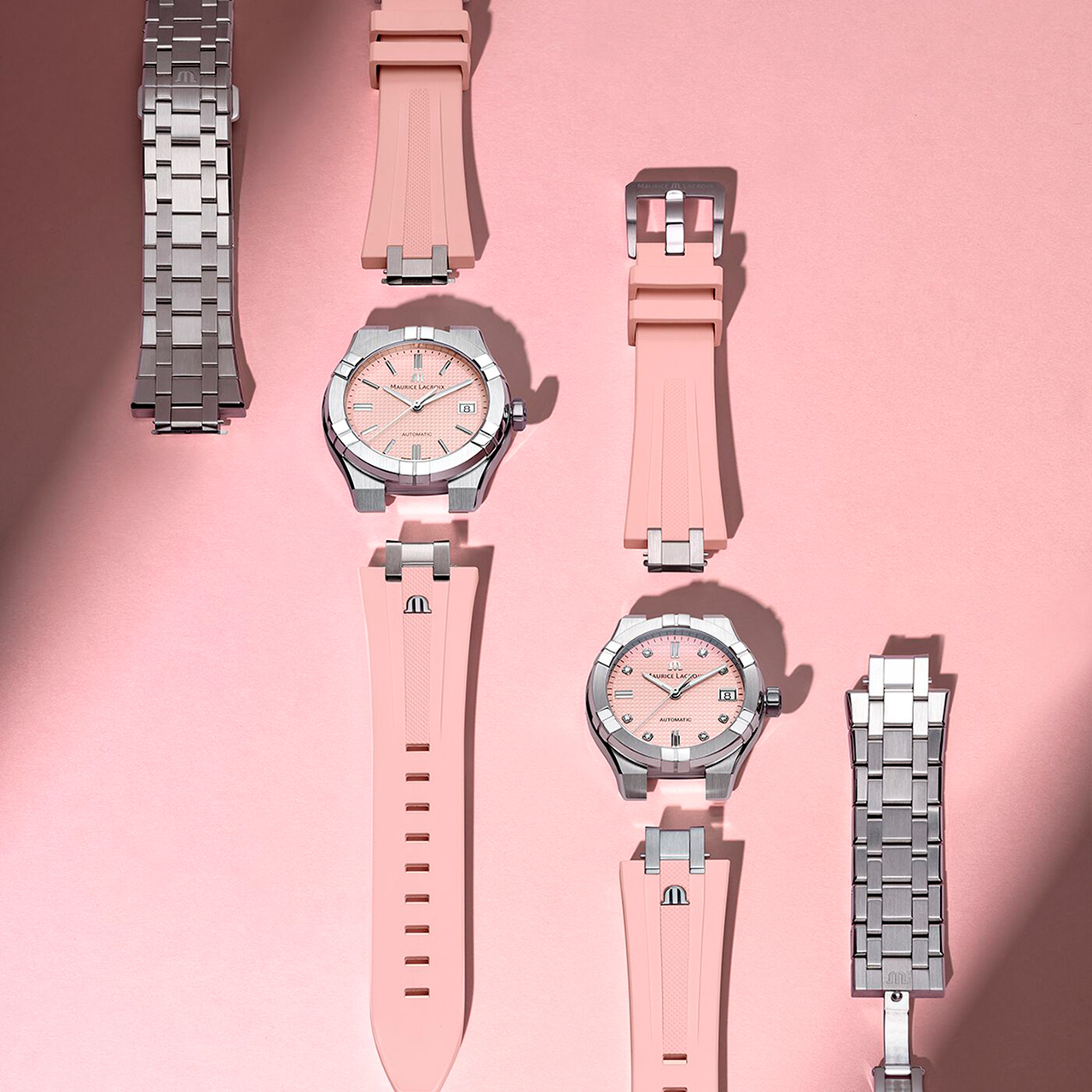 Ремешок: Модель с браслетом из нержавеющей стали с литыми звеньями в пять рядов, система быстрой замены ремешка/браслета, браслетная застежка с тройным сложением – «бабочка», раскладывающаяся при нажатии кнопок двойной блокировки, гравировка Maurice Lacroix. Часы в комплекте с розовым ремешком из натурального каучука с тиснением, классическая застежка пряжка.