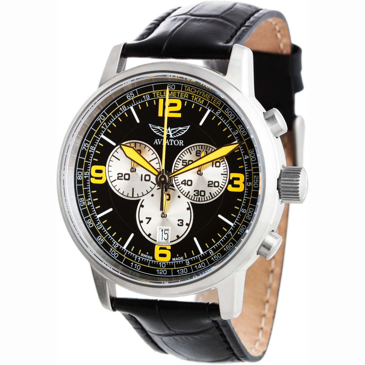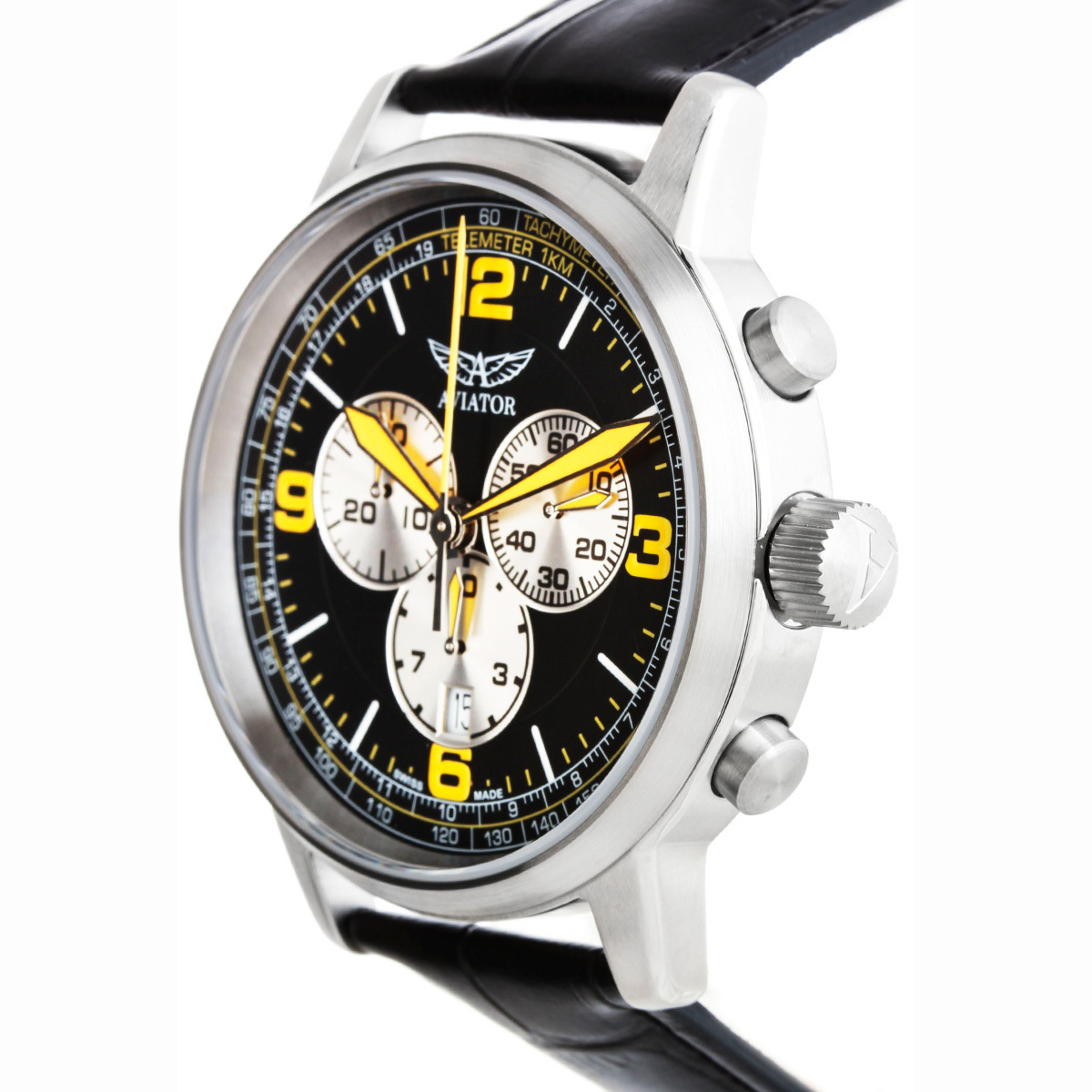 Функции: Индикация часов, минут при помощи центральных стрелок. Маленькая, отдельно вынесенная секундная стрелка. Дата в положении "6 часов". Хронограф.