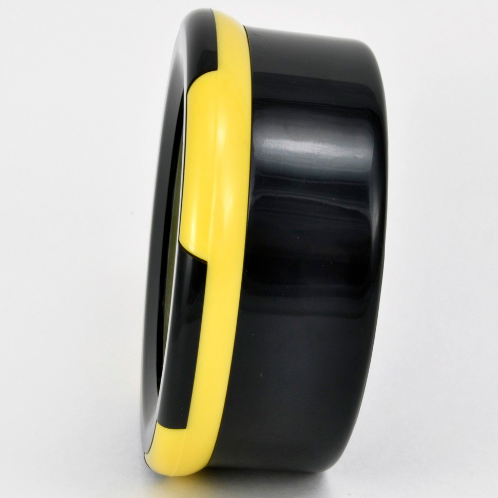 Материал и цвет: Корпус будильника сделан из глянцевого пластика черного цвета с жёлтыми вставками. Стекло – пластиковое. Четкий легко читаемый циферблат с крупными чёрными арабскими цифрами.