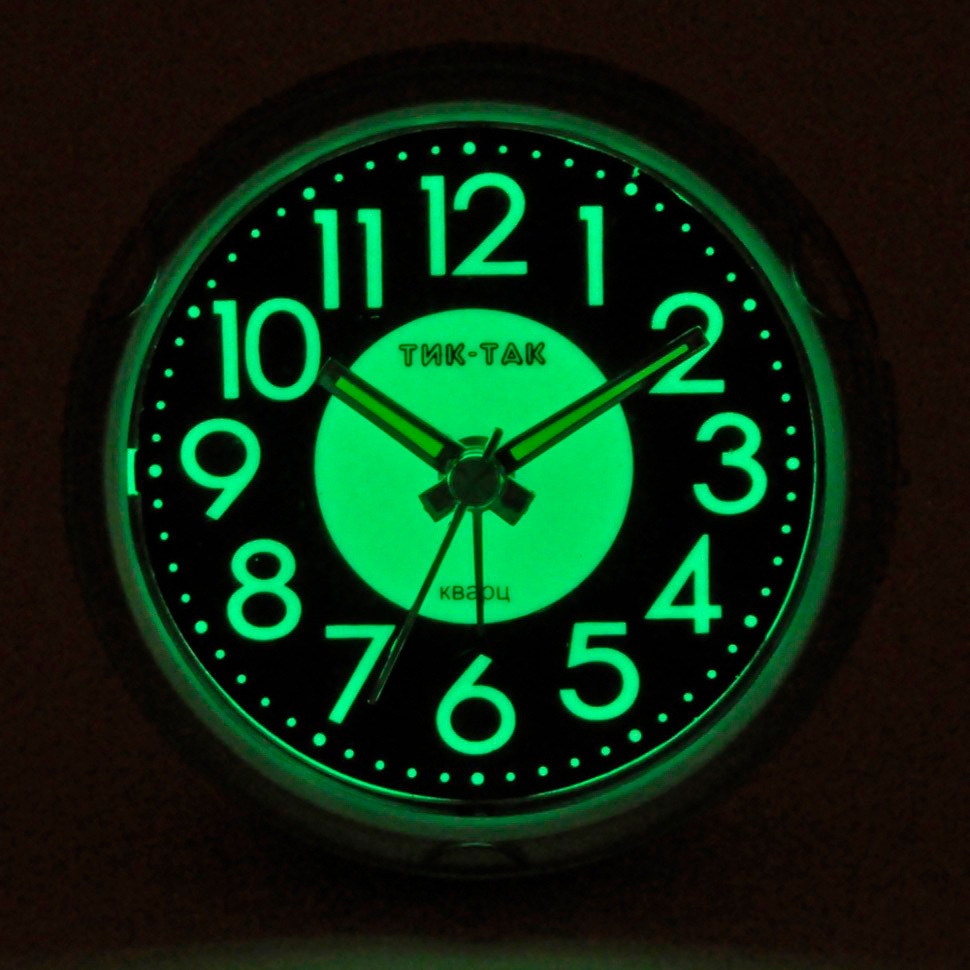 Материал и цвет: Корпус будильника сделан из качественного ABS пластика. Стекло – пластиковое. Циферблат будильника с крупными легко читаемыми цифрами. У данной модели будильника люминесцентные цифры, которые будут светиться в темноте некоторое время даже без нажатия кнопки подсветки.
