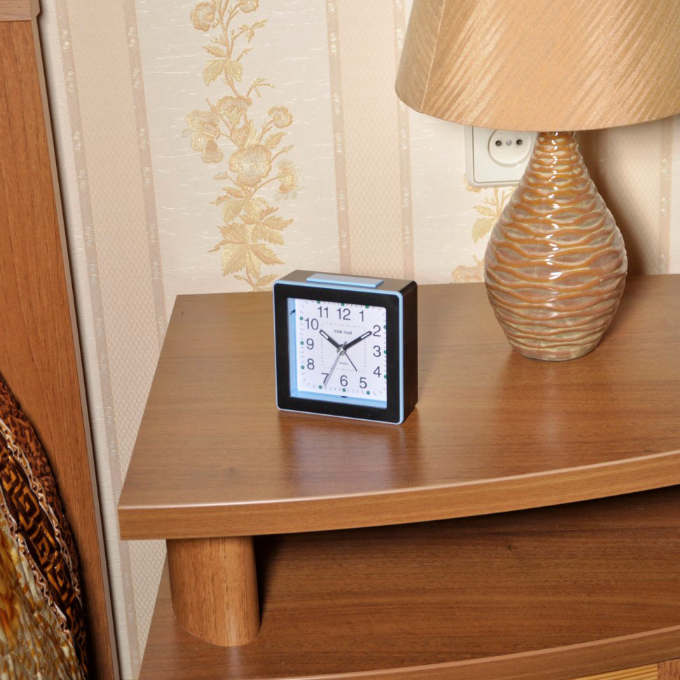Материал и цвет: Корпус будильника квадратной формы сделан из чёрного пластика со вставкой голубого цвета. Стекло – пластиковое. Белый циферблат с чёрными арабскими цифрами.
