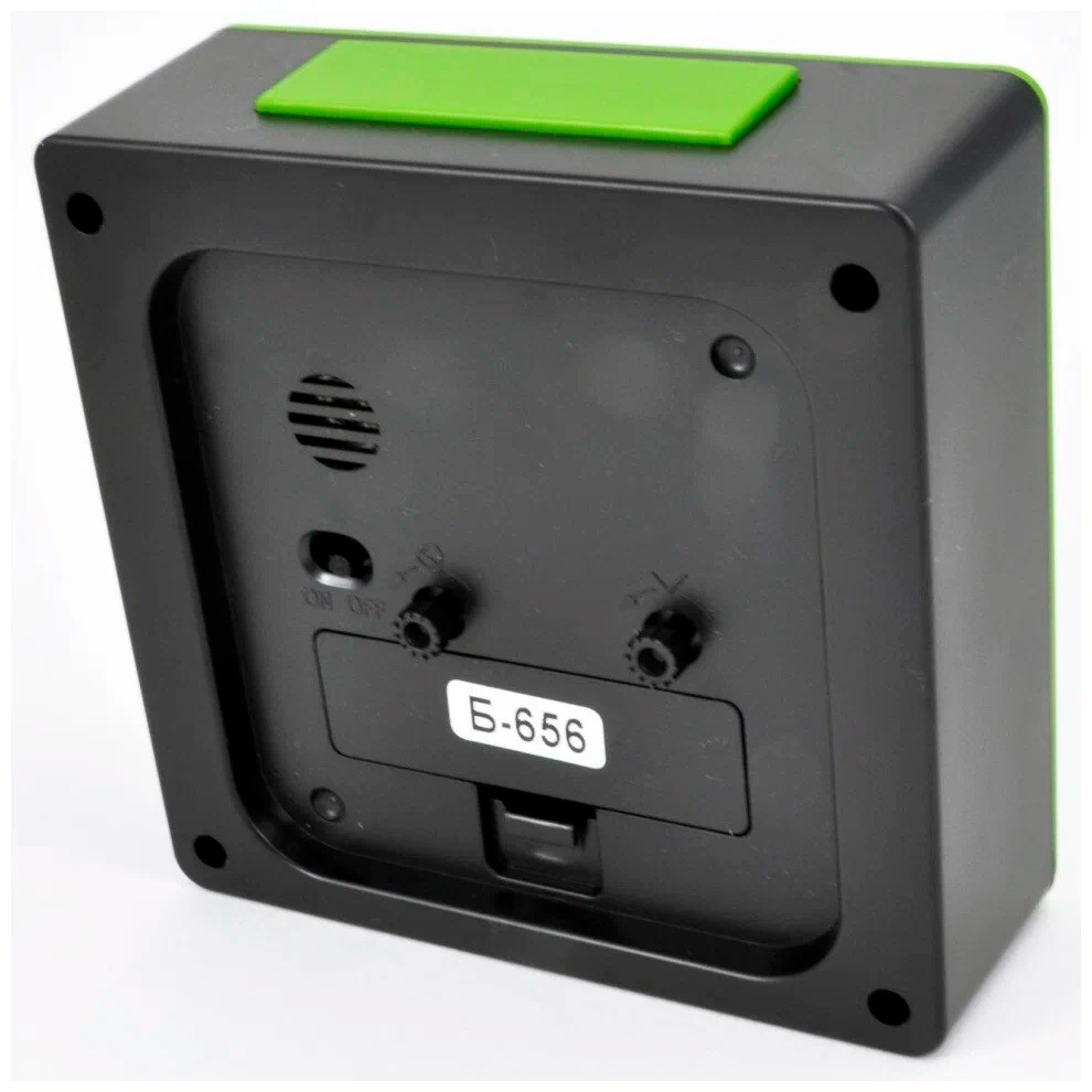 Материал и цвет: Корпус будильника квадратной формы сделан из чёрного пластика со вставкой зелёного цвета. Стекло – пластиковое. Белый циферблат с чёрными арабскими цифрами.