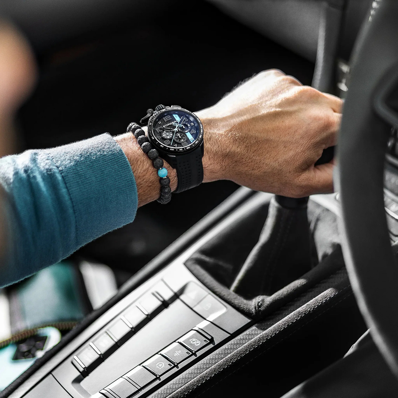 Корпус: Круглый корпус выполнен из нержавеющей стали марки 316L. Стойкое к царапинам PVD покрытие черного цвета. Черный алюминиевый безель тахометра. Циферблат из углеродного волокна с черными и бирюзовыми полосами. Уникальный дизай с завинчивающейся заводной головкой в положении «12 часов», кнопкой в положении «1» и рычагом в положении «11» вдохновлен искусством автоспорта и гонок. Аппликация часовых индексов и стрелки с покрытием Super-Luminova®. Сапфировое стекло с антибликовым покрытием. Диаметр корпуса 45 мм, толщина - 13 мм. Водостойкость 50 метров.