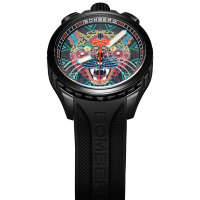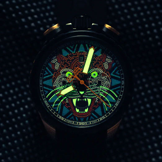 Корпус: Круглый корпус выполнен из нержавеющей стали марки 316L, стойкое к царапинам PVD покрытие черного цвета. Красочный ягуар, созданный в мексиканской технике уичоль на циферблате. Фотолюминесцентное покрытие Super-Luminova® на стрелках добавляет остроты, обеспечивая при этом идеальную читаемость даже в самых темных условиях. Уникальный дизайнс завинчивающейся заводной головкой в положении «12 часов» и кнопок хронографа. Сапфировое стекло с антибликовым покрытием. Диаметр: 45 мм. Водозащита: 50 м.