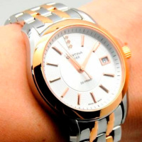 Корпус: Корпус из нержавеющей полированной/матовой стали, безель с PVD - покрытием розового цвета. Металлик циферблат украшен узором "гильоше", три бриллианта на "12 часов". Стрелки и риски золотистого цвета. Сапфировое стекло с антибликовым покрытием. Диаметр 32 мм. Водостойкость 100 м. Система DS.