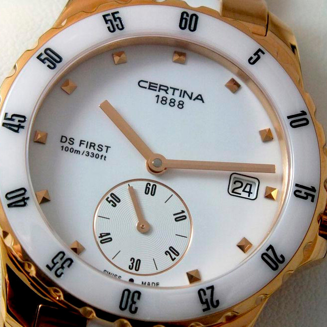 Корпус: Корпус из нержавеющей полированной/матовой стали с PVD - покрытием розового золота . Безель с 60 - минутной шкалой на керамическом белом кольце. Белый циферблат. Стрелки и часовые индексы золотистого цвета. Сапфировое стекло. Диаметр 34.8 мм. Водостойкость 100 м. Система DS.