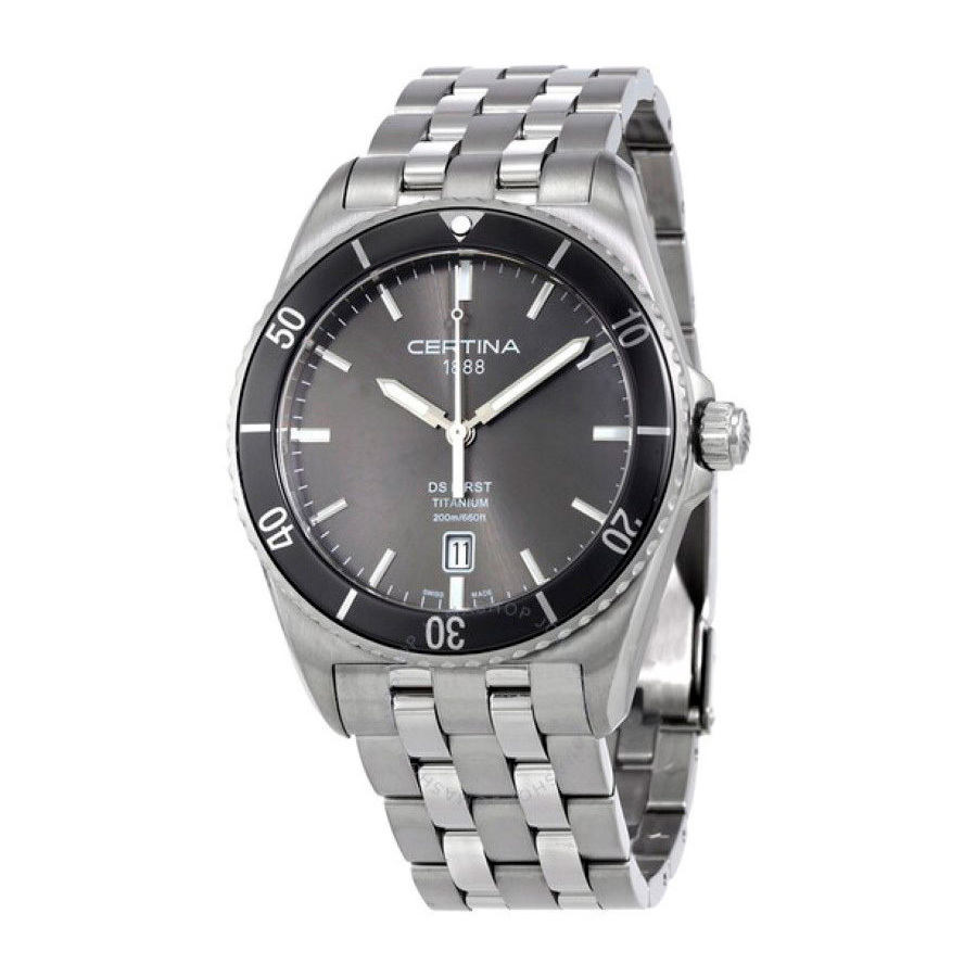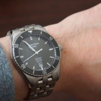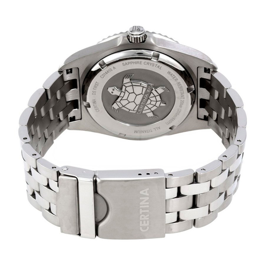 Корпус: Корпус из полированного/матового титана. Безель с 60 - минутной шкалой на керамическом чёрном кольце. Серый циферблат. Стрелки и часовые индексы золотистого цвета. Сапфировое стекло с антибликовым покрытием. Диаметр 41 мм. Водостойкость 200 м. Система DS.