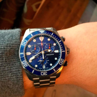 Корпус: Корпус из нержавеющей полированной/матовой стали. Вращающийся в одном направлении безель с 60 - минутной шкалой на синем кольце . Синий циферблат с серебристыми стрелками и рисками. Люминесцентное покрытие часовой, минутной стрелок и часовых индексов. Сапфировое стекло с антибликовым покрытием. Завинчивающаяся заводная коронка. Диаметр 43 мм. Водостойкость 300 м. Система DS.