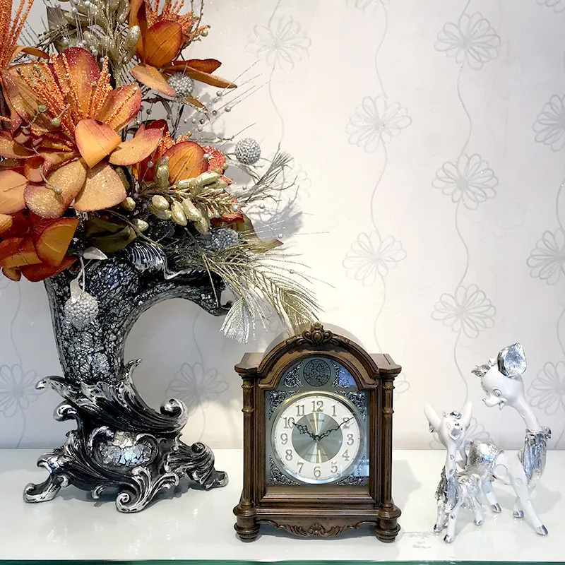 Цвет: Цвет корпуса - орех. Часы имеют изысканный циферблат с рельефным рисунком, красиво выполненный с рельефными цифрами золотого оттенка на циферблате из слоновой кости и золота. Чёрные фигурные стрелки.