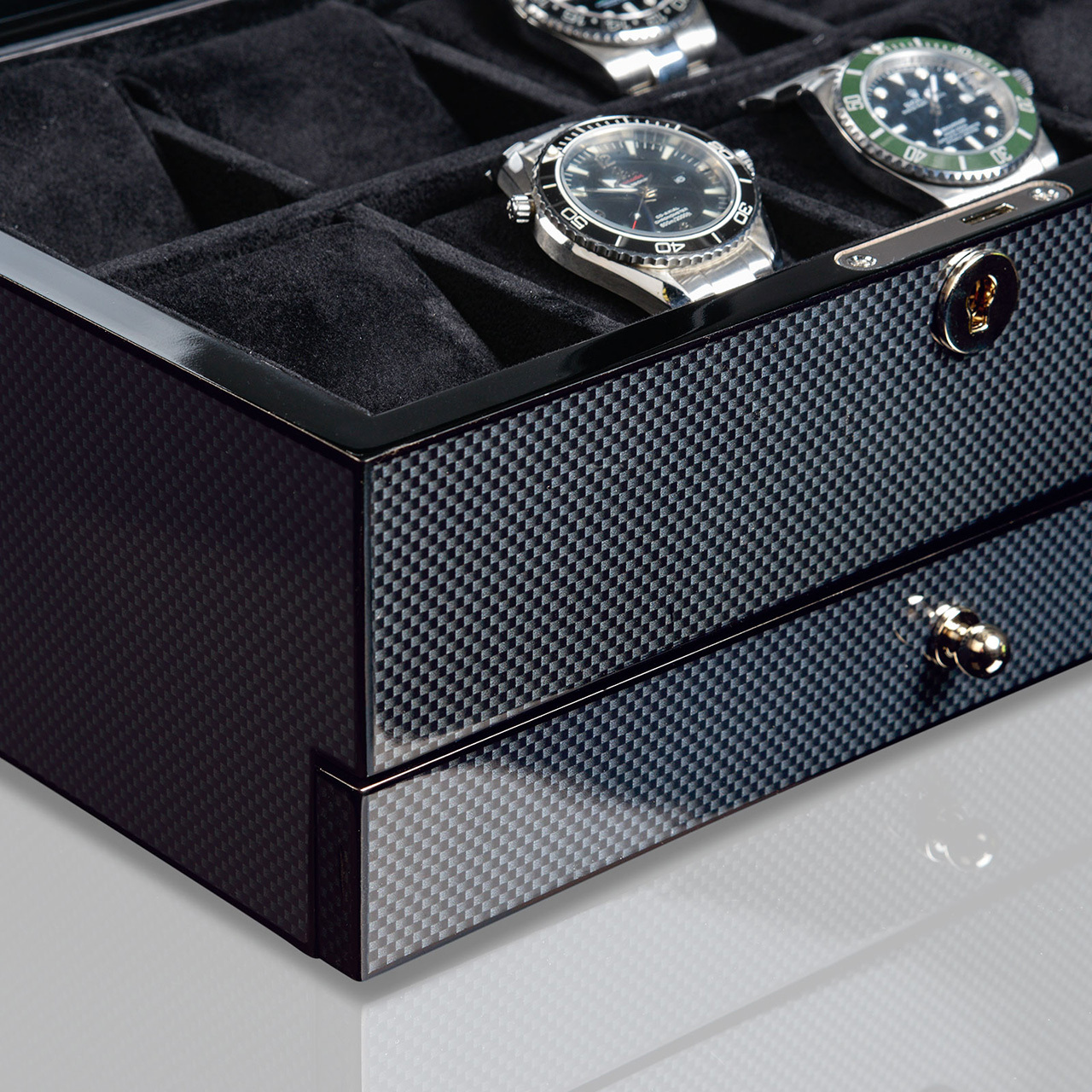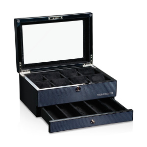 Материал: Шкатулка из натурального дерева, чёрного цвета. Глянцевая поверхность из карбона сразу напоминает элементы гонок и придает коробке для часов спортивную, роскошную элегантность. Внутренняя часть обшита мягкой тканью для защиты часов. Все часы помещены на отдельную подушку для часов, которая расположена в квадрате, огороженном решетками для защиты. Чтобы обеспечить удобное хранение часов даже с большими часами, размер каждого karee составляет примерно 90x47 мм. Мягкие подушечки для часов имеют ширину около 46 мм. Окружность составляет около 175 мм.