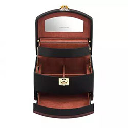 Описание: Шкатулка "Copenhagen" для украшений с автоматически открывающимися отделениями. Корпус шкатулки обтянут тканью техношелк черного цвета. Функциональное внутреннее пространство: три просторных секции с автоматическим открыванием: нижний ящик- универсальный, на среднем четыре секции, верхний содержит одну секцию для колец и одна универсальная, прикрытая сберегающей подушечкой. Зеркало с внутренней стороны верхней крышки. Надежный патентованный замок. Удобная ручка для переноски. Внутри шкатулка отделана мягкой бархатистой на ощупь тканью темно-пудрового цвета.