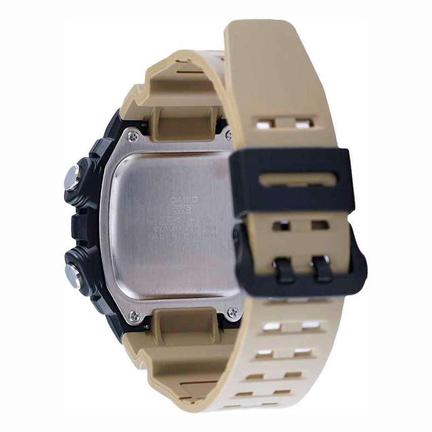 Корпус: Корпус из полимерного материала серого цвета. Циферблат ЖК серый, защищён акриловым стеклом. Яркая светодиодная подсветка позволяет использовать часы в темноте, LED-индикатор мигает при окончании работы секундомера или таймера. Стальная задняя крышка крепится на 4-х винтах. Габаритные размеры: 50,4 x 50,5 мм, толщина 13,5 мм, вес 63г. Водозащита: 20 ATM.