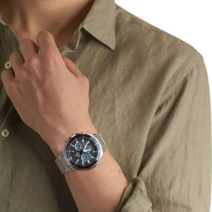 Корпус: Корпус часов сделан из металла. Черный циферблат с синим безелем и метками в виде штрихов. Светящееся покрытие необрит на стрелках и метках обеспечивает длительную подсветку в темное время суток после короткого воздействия света. Стекло сапфировое. Заводная головка с защитой. Задняя крышка с винтовым фиксатором. Размеры: 48 мм x 53 мм x 12,2 мм. Водозащита 100 м.