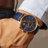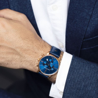 Корпус: Корпус из нержавеющей стали с покрытием PVD. Синий сатинированный циферблат, золотистые стрелки и риски. Сапфировое стекло. Водонепроницаемость 50 метров. Размер 40 мм.
