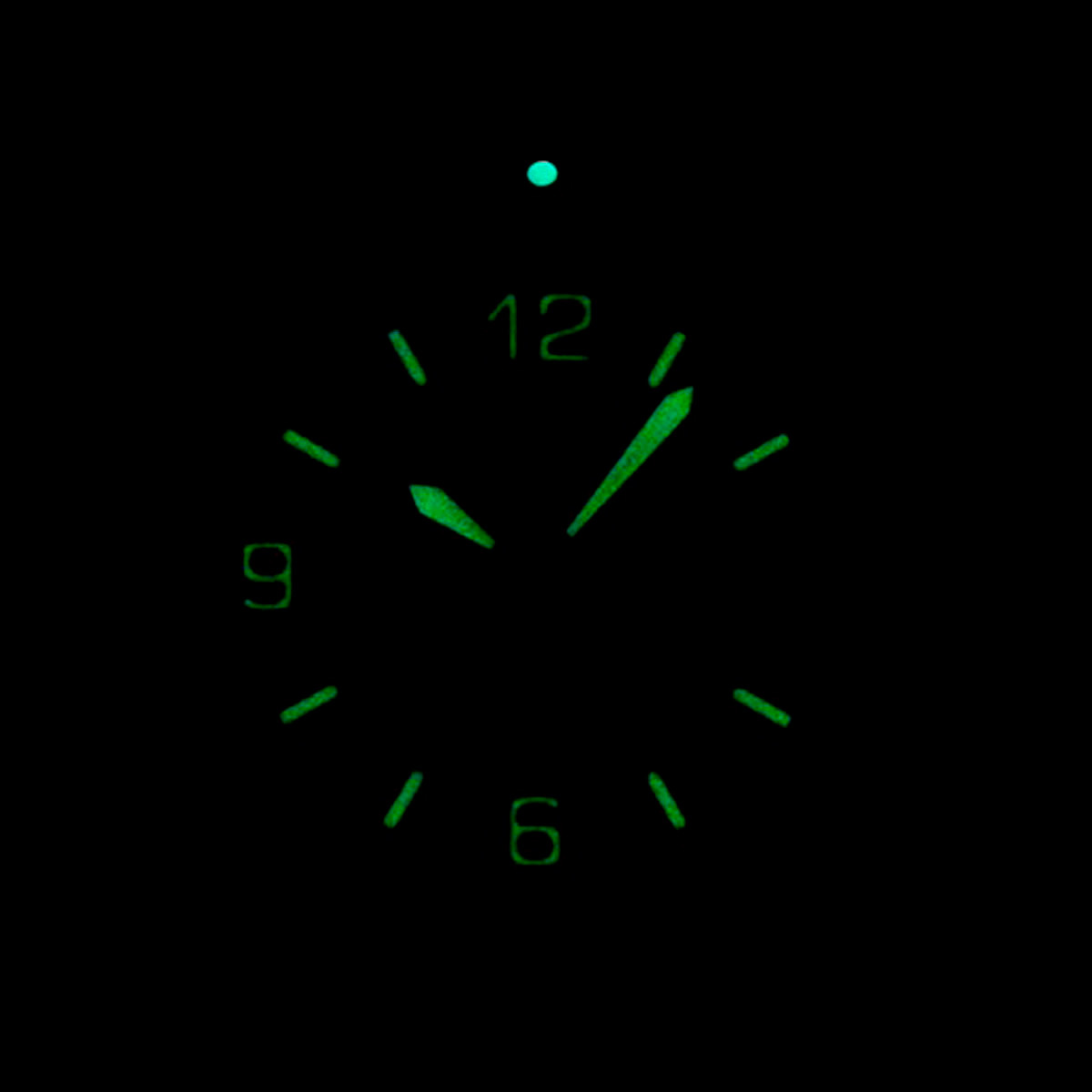 Корпус: Корпус выполнен из нержавеющей стали, поверхности с матовой шлифовкой. Однонаправленный безель вращается со щелчками только в направлении против хода стрелок, боковая грань с ребристой насечкой, фронтальная поверхность с покрытием чёрного цвета и контрастной разметкой, на отметке “12 часов” находится капсула со светящимся в темноте фотолюминесцентным элементом. Циферблат чёрного цвета цвета с шлифовкой “солнечные лучи”. Часовые индексы и стрелки выполнены из стали с покрытием SuperLuminova, которое обеспечивает подсветку в темное время суток. Минеральное стекло. Завинчивающаяся заводная головка и задняя крышка для более уверенной водонепроницаемости часов. Диаметр корпуса 41 мм. Водонепроницаемости WR 200 (20 атм), подходит для глубокого погружения.