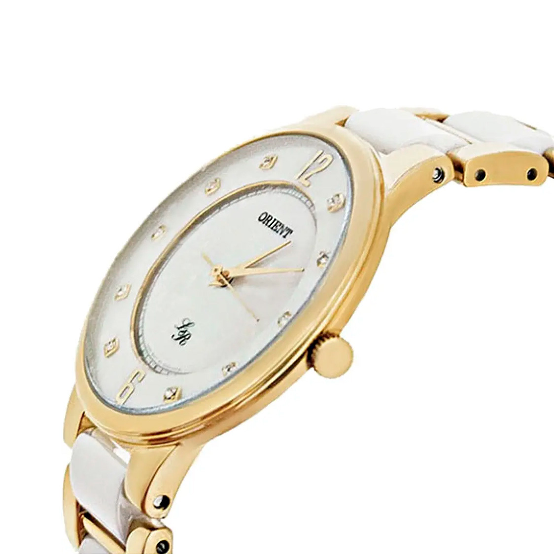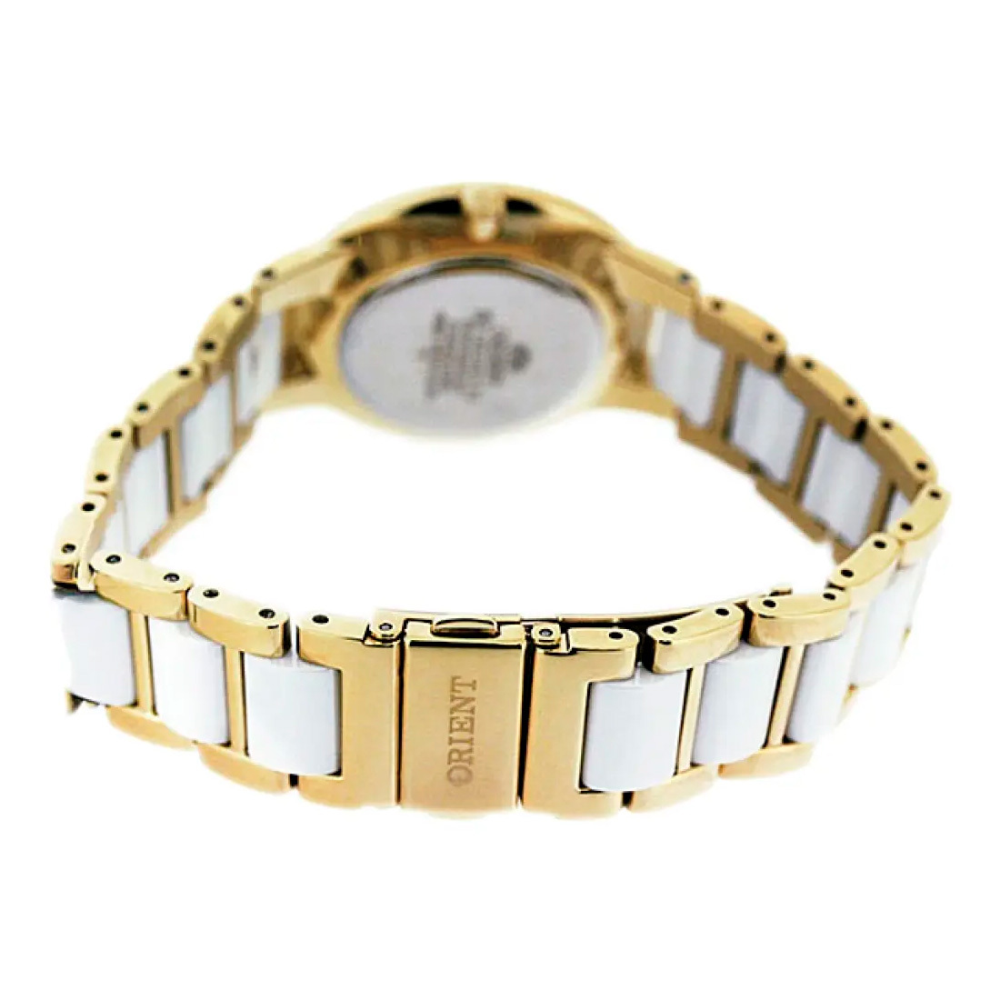 Корпус: Корпус этих часов выполнен из нержавеющей стали с IP покрытием золотистого цвета. Минеральное стекло. Перламутровый циферблат украшен кристаллами. Диаметр корпуса 36 мм, толщина 9 мм. Водоустойчивость 30 метров.