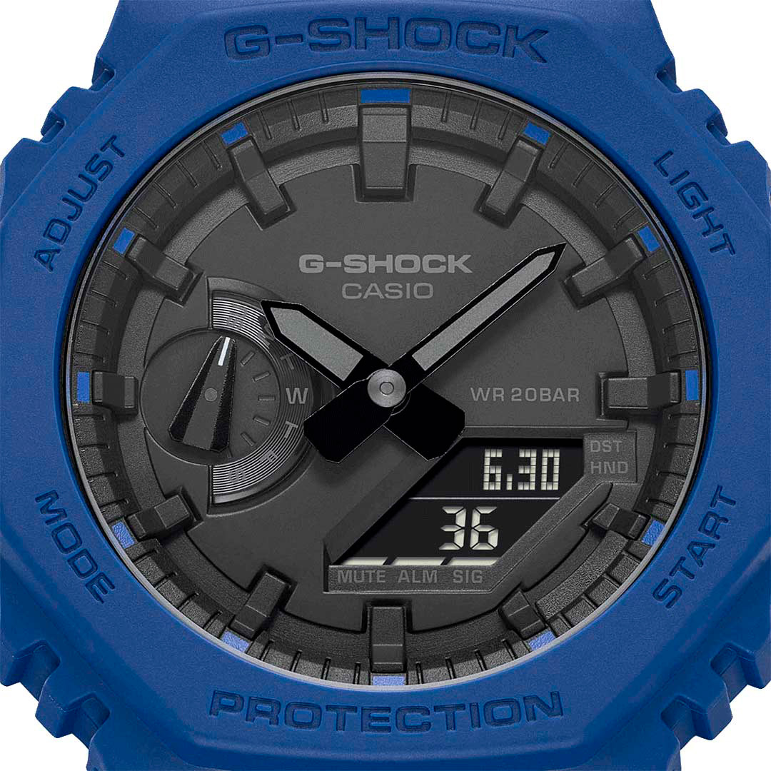 Корпус: Новая серия часов со структурой Carbon Core Guard. Корпус восьмиугольной формы выполнен из высокопрочного мелкодисперсного полимерного материала синего цвета, содержащего углеродное волокно, более прочный и, в то же время, более легкий. Оранжевые метки и стрелки со светонакопительным покрытием Neobrite. Двойная подсветка Super illuminator с функцией Afterglow (для подсветки не нужно удерживать кнопку, время послесвечения настраивается 1,5 или 3 сек): одновременно подсвечивается аналоговый циферблат и цифровой дисплей. Размер корпуса (Д × Ш × В) 48,5 × 45,4 × 11,8 мм. Водонепроницаемость 200 метров.