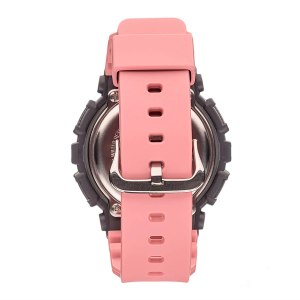 Корпус: Противоударный корпус из полимерного материала защищает механизм от ударов и вибрации. Часы защищены от магнитных полей. Модель отличает двуцветная расцветка, а именно черный полимерный корпус с контрастными стрелками и розовый ремешок. Высококонтрастный электронный ЖК-циферблат защищен минеральным стеклом. Циферблат подсвечивается светодиодом, функция автоподсветки освещает циферблат при повороте часов к лицу. Цвет подсветки оранжевый. Размер 45,4 мм x 49,0 мм х 15,8 мм. Водозащита 200 метров.