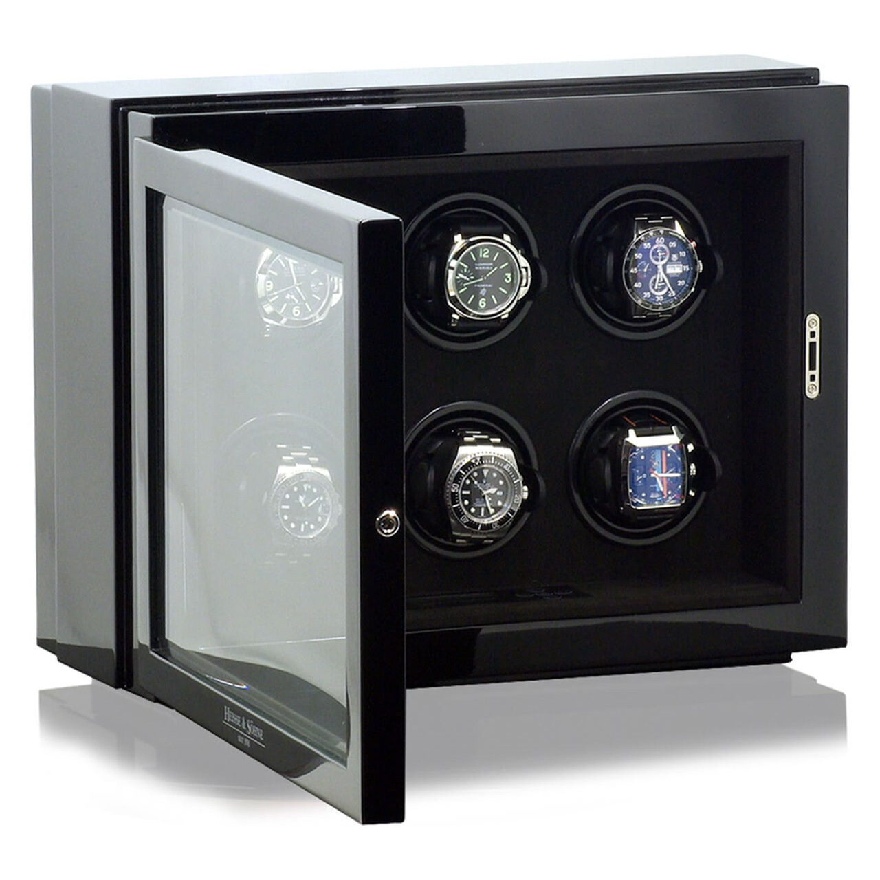 Материал: Шкатулка с приводом (watch winders) прямоугольной формы подставке, для хранения и поддержания в рабочем состоянии наручных часов с автоподзаводом в количестве 6 штук. Входит в коллекцию «Collector». Корпус ручной работы выполнен из твёрдой древесины, с применением алюминия и минерального стекла. Отделка корпуса представляет собой многослойное глянцевое покрытие лаком чёрного цвета. Внутреннее пространство имеет кожаную серую отделку и светодиодную подсветку. В шкатулке установлены мощные надёжные двигатели с бесшумной работой и индивидуальным программным обеспечением. Двигатели имеют длительный эксплуатационный ресурс.