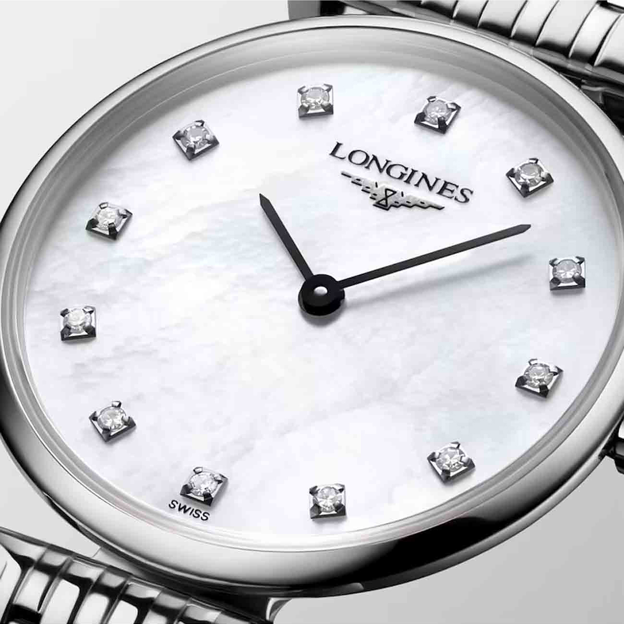 Корпус: Нержавеющая сталь, сапфировое стекло, 12 бриллиантов на циферблате. Размер 24 мм, водонепроницаемость 30 метров. Циферблат – перламутровый белый.
