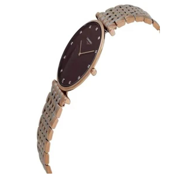 Корпус: Нержавеющая сталь + PVD-покрытие из розового золота, сапфировое стекло, 12 бриллиантов на циферблате. Размер 37 мм. Водонепроницаемость 30 метров. Циферблат – коричневый металлик.