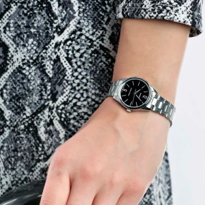 Корпус: Корпус часов выполнен из гипоаллергенной латуни с хромированным покрытием. Циферблат чёрного цвета с метками в виде рисок и арабких цифр. Минеральное стекло. Габаритные размеры: 28,2x34мм, толщина 7,5мм, вес 52г. Водозащита 30 WR.