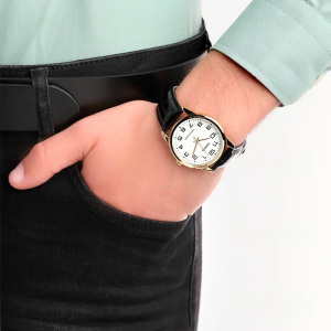 Ремешок: Кожаный ремешок чёрного цвета с классической застежкой.