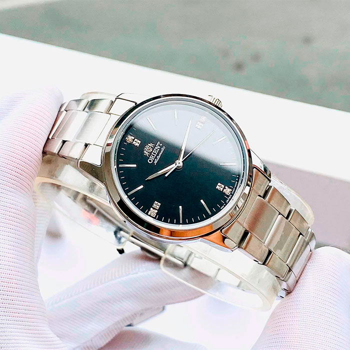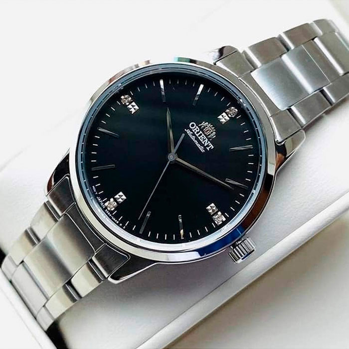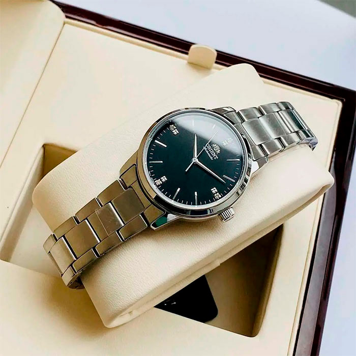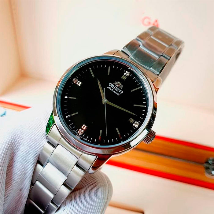 Корпус: Круглый корпус выполнен из матовой нержавеющей стали. Черный циферблат украшен фианитами. Прочное минеральное стекло устойчивое к мелким механическим повреждениям. Диаметр корпуса составляет 32 мм. Водостойкость WR 100 (плавание без погружения).