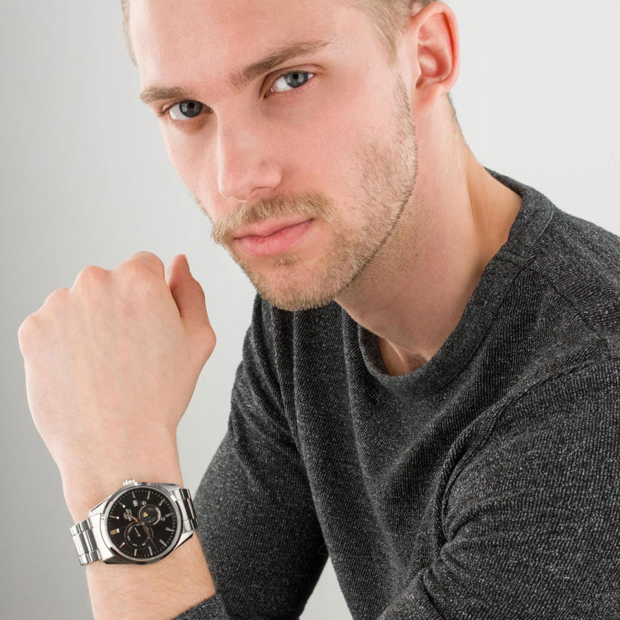 Корпус: Корпус из высококачественного стального сплава с высокими антикоррозийными свойствами. Циферблат чёрного цвета с часовыми метками в виде штрихов. Сапфировое стекло устойчивое к царапинам. Завинчивающаяся задняя крышка. Диаметр корпуса: 41,5 мм. Толщина: 12 мм. Водонепроницаемость: 50 м.