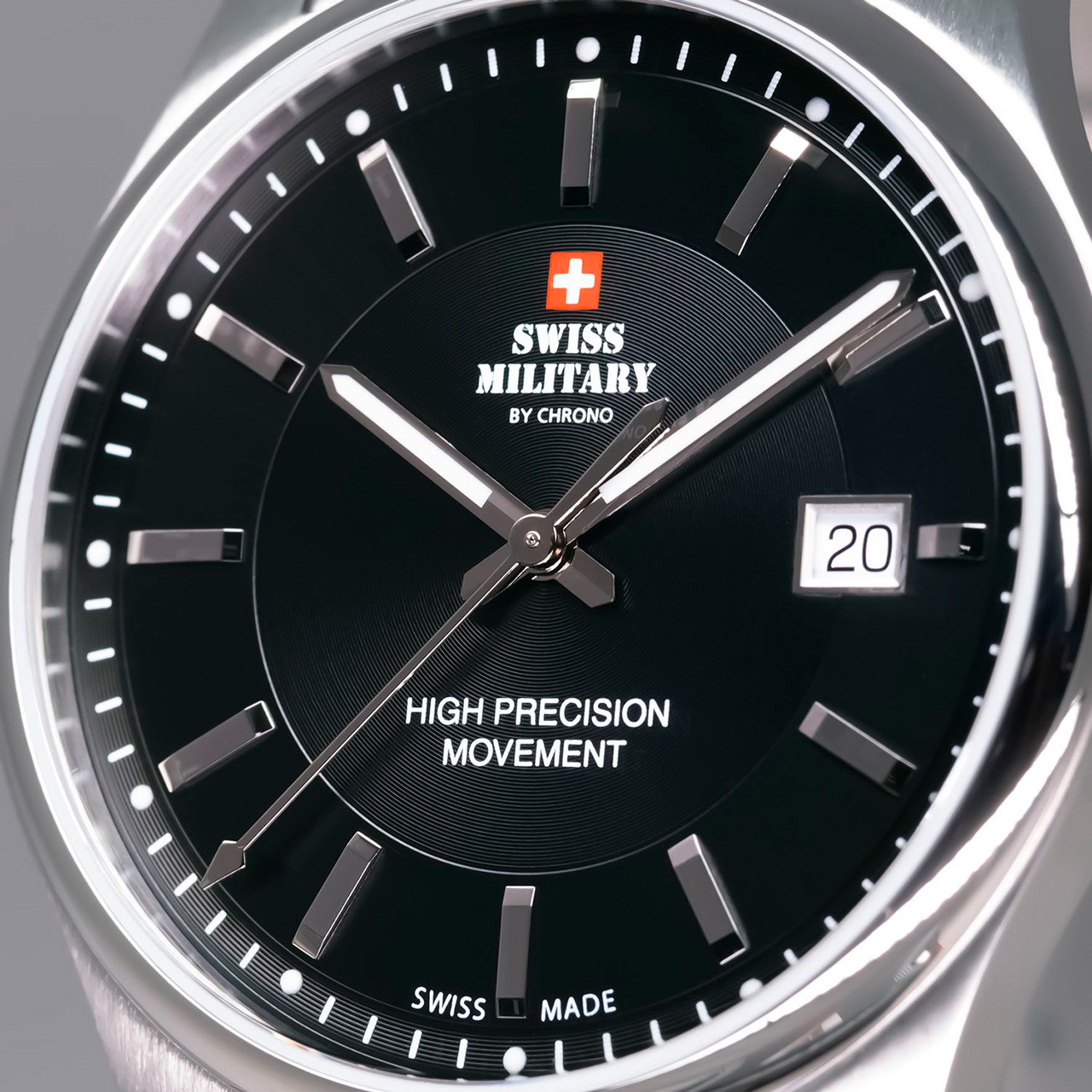 Корпус: Корпус выполнен из нержавеющей стали. Чёрный циферблат. Стрелки и часовые индексы из полированного металла. Сапфировое стекло. Водонепроницаемость 100 метров. Диаметр 39 мм.