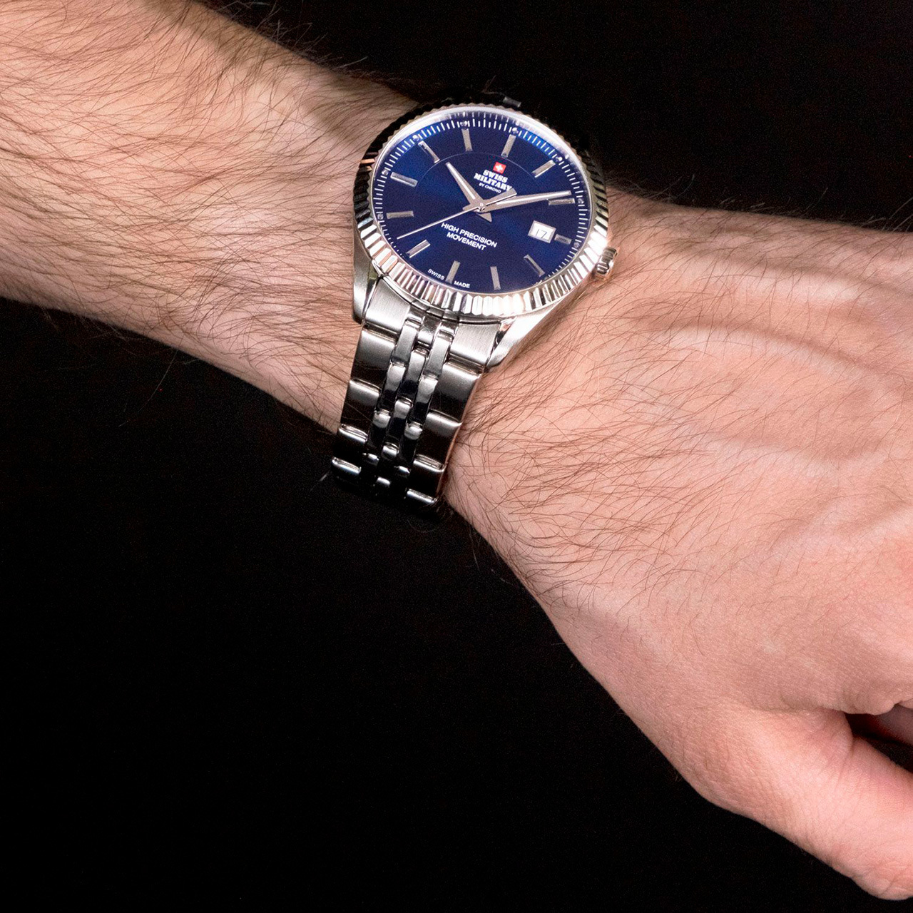 Корпус: Корпус выполнен из нержавеющей стали. Синий циферблат. Стрелки и часовые индексы из полированного металла. Минеральное стекло с сапфировым покрытием. Водонепроницаемость 50 метров. Диаметр 40 мм.