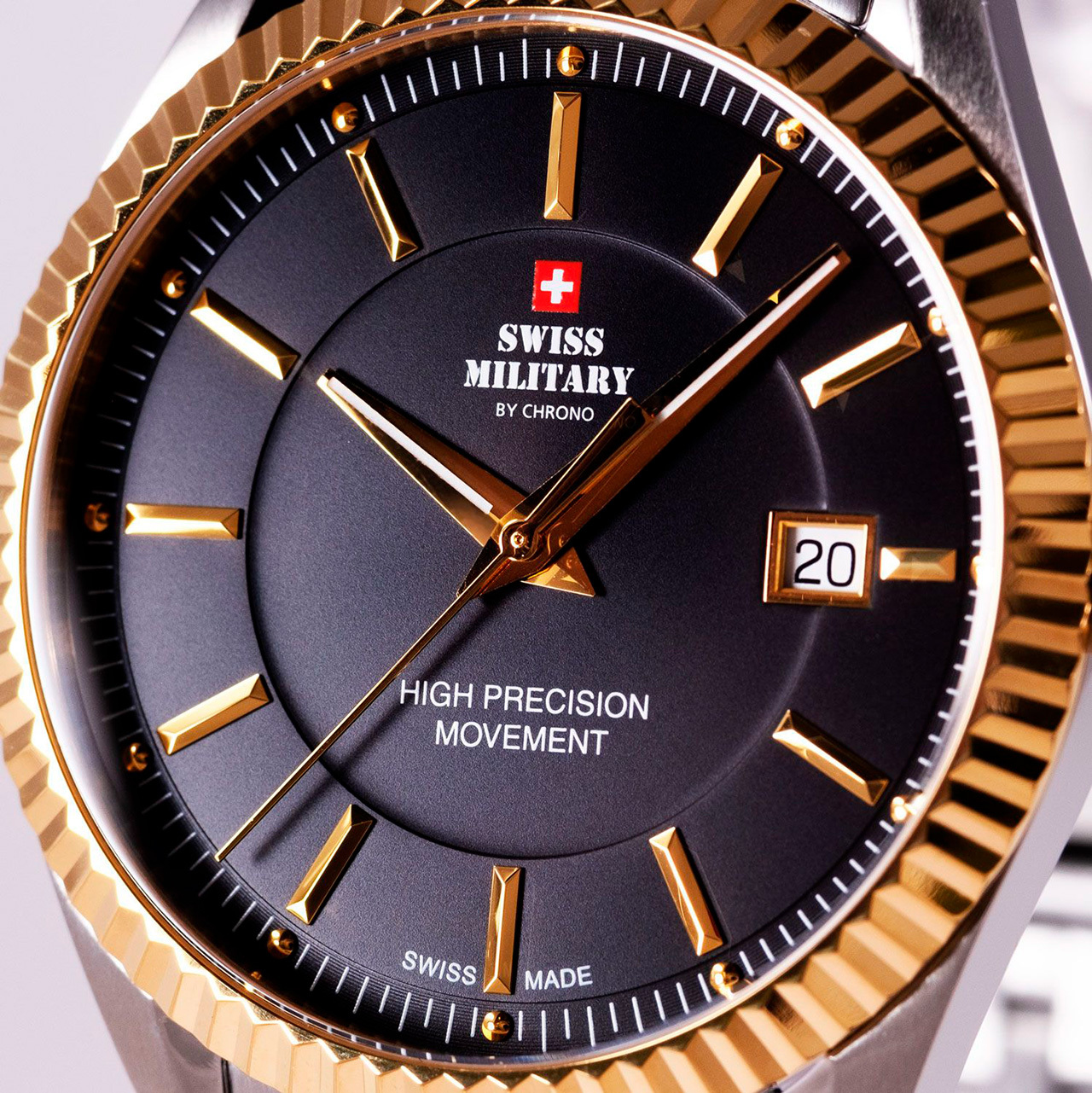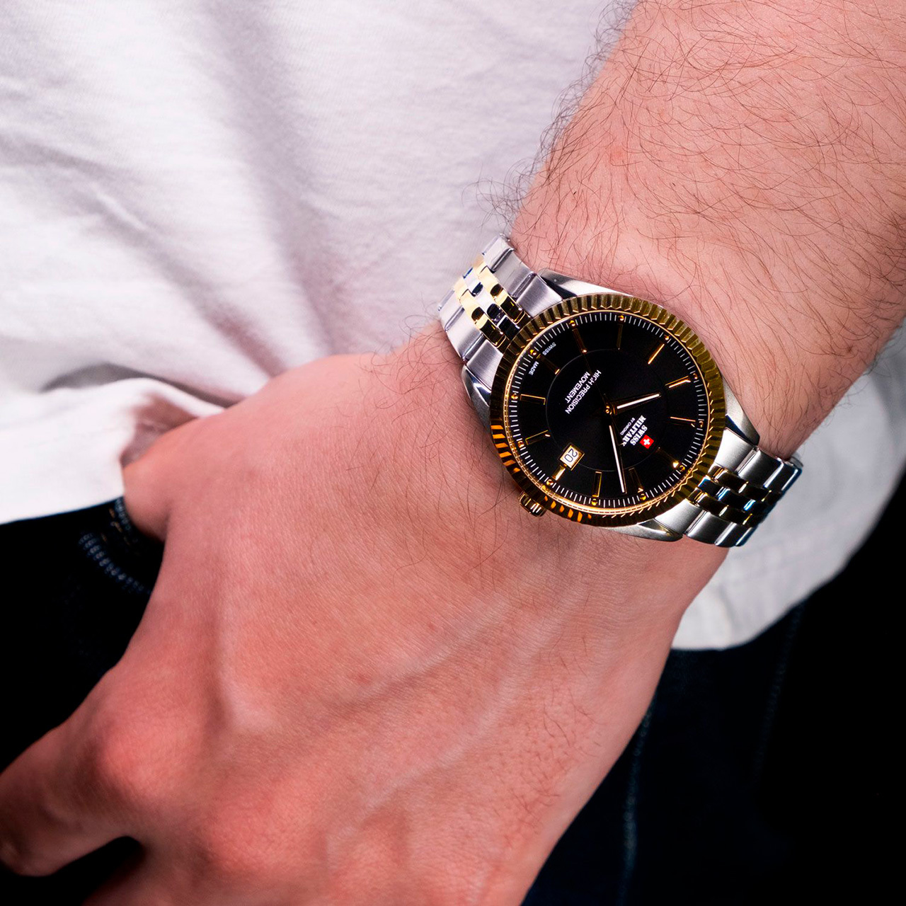 Корпус: Корпус выполнен из нержавеющей стали с частичным PVD покрытием цвета желтого золота. Чёрный циферблат. Минеральное стекло с сапфировым покрытием. Водонепроницаемость 50 метров. Диаметр 40 мм.