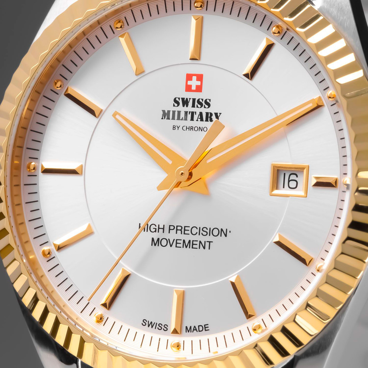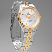 Корпус: Корпус выполнен из нержавеющей стали с частичным PVD покрытием цвета желтого золота. Светлый циферблат. Минеральное стекло с сапфировым покрытием. Водонепроницаемость 50 метров. Диаметр 40 мм.