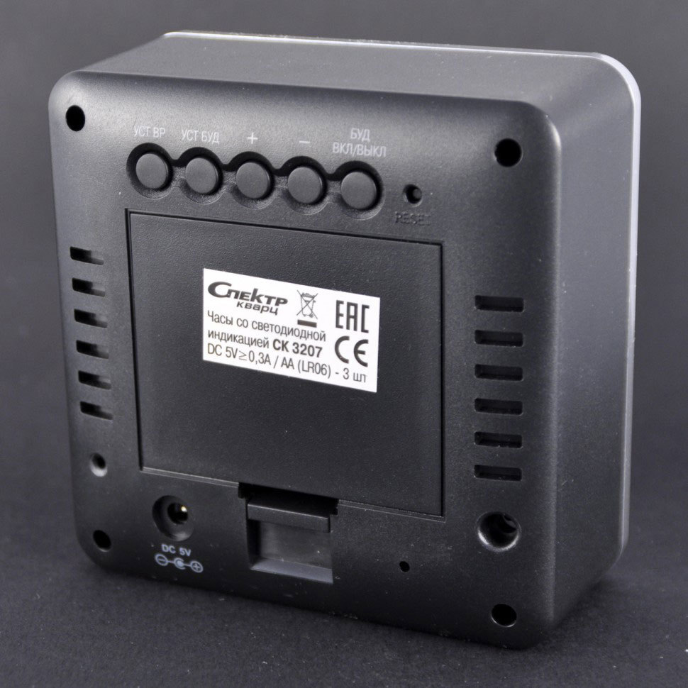 Механизм: Кварцевый будильник с термометром и цифровой индикацией. Данная модель работает от сети 220В (адаптер не входит в комплект, шнур USB длиной 1 метр в комплекте). Цифровая индикация светится (видно в темноте). Имеется резервное питание от батареек тип R6(AA) x 3 шт. (не входят в комплект), используется для сохранения настроек времени и срабатывания будильника на случай отключения электричества. Функциональность: ежедневный будильник, отображение времени в 12 или 24 часовом формате, регулировка яркости индикации (3 ступени, также имеется возможность полностью отключить свечение дисплея), ночной режим яркости (при настроенном ночном режиме, в установленный промежуток времени яркость индикации дисплея автоматически будет установлена на минимальный уровень), термометр с возможностью индикации температуры в градусах Цельсия (°C) или Фаренгейтах (°F). Часы могут работать, в том числе, только от батареек, т.е. без подключения к внешнему источнику питания. Когда часы работают только от батареек, дисплей всё время выключен, при этом нажатие любой кнопки или кратковременное нажатие на корпус часов сверху включит индикацию примерно на 10 секунд. Питание осуществляется от порта USB. В комплекте с часами идёт USB шнур (1,5 метра) для питания часов от USB источника (5V). Для питания можно использовать, например, любой адаптер, предназначенный для зарядки мобильных телефонов, и имеющий USB выход. Блока питания от сети 220V в комплекте нет.