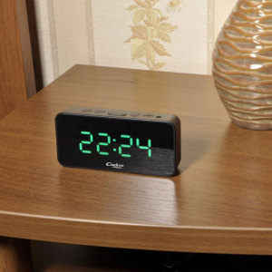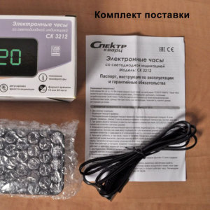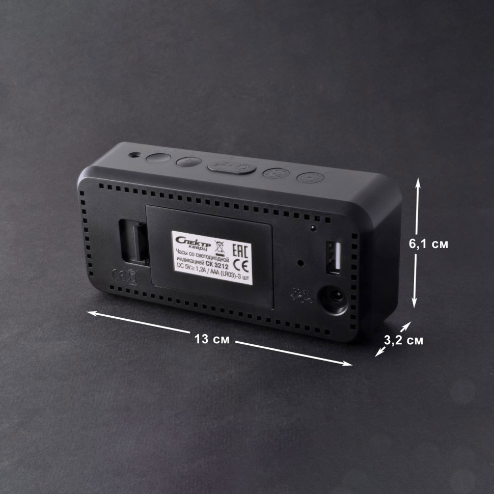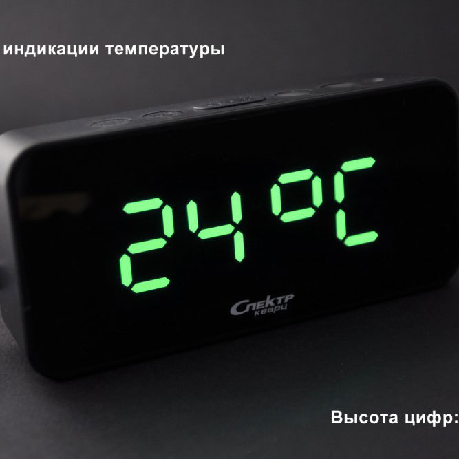 Механизм: Часы настольные с цифровой индикацией с будильником и измерением температуры. Яркость свечения часов можно менять (три уровня яркости) или полностью отключить индикацию. В режиме выключенной индикации нажатие любой кнопки кратковременно включит индикацию. Также у часов есть ночной режим работы индикации, который позволяет автоматически снизить яркость свечения в тёмное время суток. При включённом ночном режиме, в настроенный промежуток времени яркость индикации дисплея автоматически будет установлена на минимальный уровень. Часы могут работать в трёх режимах: отображение текущего времени, отображение температуры окружающего воздуха и режим попеременного отображения времени и температуры. Две центральные точки на дисплее часов не мигают. Часы могут работать, в том числе, только от батареек, т.е. без подключения к внешнему источнику питания. Когда часы работают только от батареек, дисплей всё время выключен, при этом нажатие любой кнопки или кратковременное нажатие на корпус часов сверху включит индикацию примерно на 10 секунд. У часов есть один будильник. Температура может показываться в градусах Цельсия или в градусах Фаренгейта. Питание осуществляется от порта USB. В комплекте с часами идёт USB шнур (1,5 метра) для питания часов от USB источника (5V). Для питания можно использовать, например, любой адаптер, предназначенный для зарядки мобильных телефонов, и имеющий USB выход. Блока питания от сети 220V в комплекте нет.