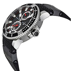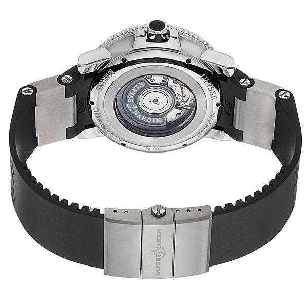 Представленные мужские часы, выполненные в спортивном стиле, превосходно сочетают в себе идеально созданный дизайн и современное техническое оснащение. Эта модель, разработанная фирмой Ulysse Nardin, отличается своим напористым мужским характером. Изготовленный из нержавеющей стали и титана корпус часов, имеет размер 45 мм. Корпус часов толщиной 14,6 мм. Механизм с автоматическим подзаводом работает от амплитуды движения руки. Часы предназначены для того, чтобы в них плавали и имеют водонепроницаемость до 200 м. Циферблат закрыт прозрачным сапфировым стеклом с антибликовым покрытием. Для изготовления задней крышки корпуса часов также применяется сапфировое стекло, благодаря чему обеспечивается обзор на работу часового механизма. Ремешок, изготовленный из каучука с раскладывающейся застежкой из стали, выполнен в строгом стиле и воплощает элегантность. Запас хода до 42 часов. Хронометр.