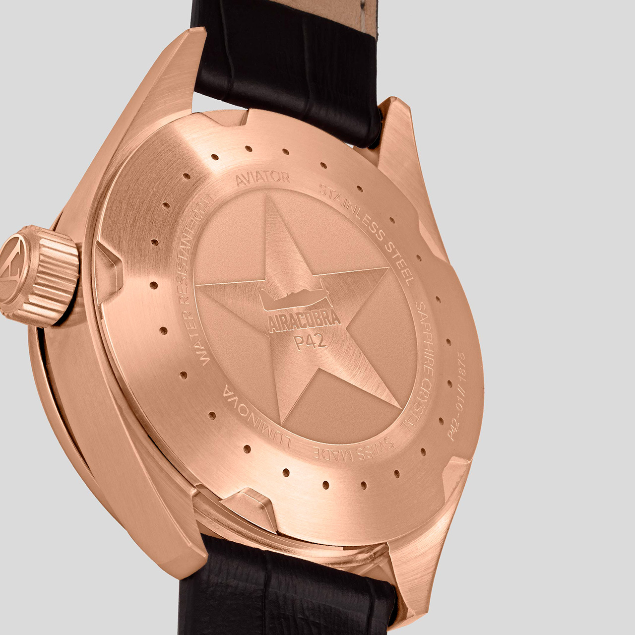 Корпус: Нержавеющая сталь с розовым PVD - покрытием. Циферблат коричневый, стрелки и часовые индексы с люминесцентным покрытием. Диаметр 42 мм. Сапфировое стекло с антибликовым покрытием. Задняя крышка имеет резьбовое соединение с корпусом. Переводная коронка с двойным уплотнителем и винтовой фиксацией для дополнительной защиты от попадания воды. Водозащита 100 метров.