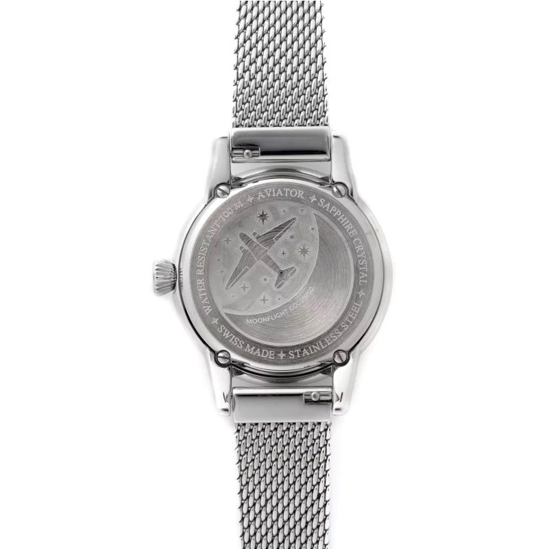 Корпус: Корпус круглой формы выполнен из нержавеющей стали марки 316L. Циферблат глубокого синего цвета ночного неба с различными видами финишной обработки. В центральной части стилизация под гильоширование, окруженная шлифовкой в стиле «солнечные лучи». Аппликация часовых индексов и меток-точек. Облака рядом с индикатором фаз Луны с инкрустацией перламутром. Сапфировое стекло с двусторонним антибликовым покрытием имеет повышенную устойчивость к возникновению царапин. Задняя крышка с гравированным изображением авиалайнера Douglas DC-3 имеет винтовое соединение с корпусом. Диаметр: 36 мм. Водостойкость 100 метров (10 АТМ).