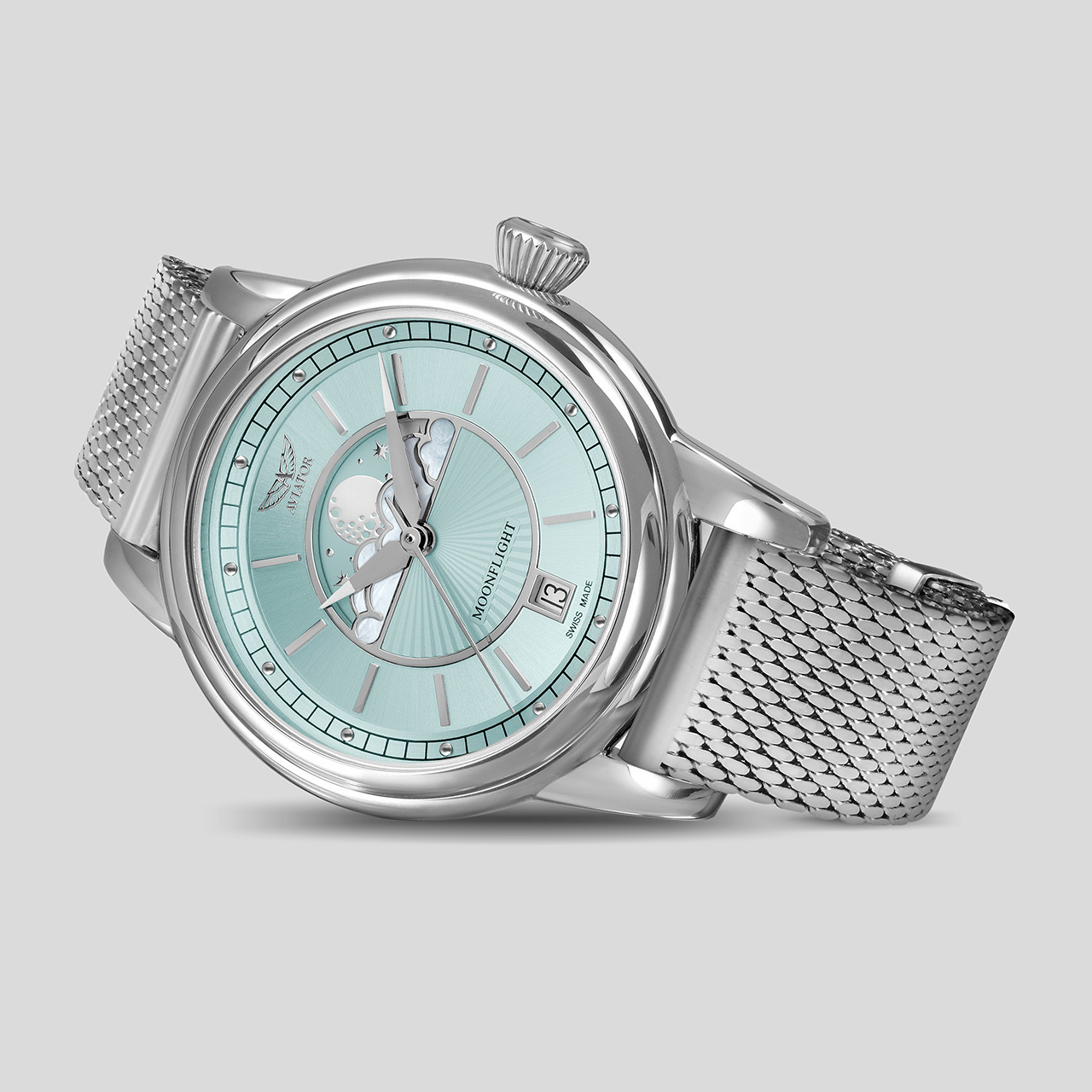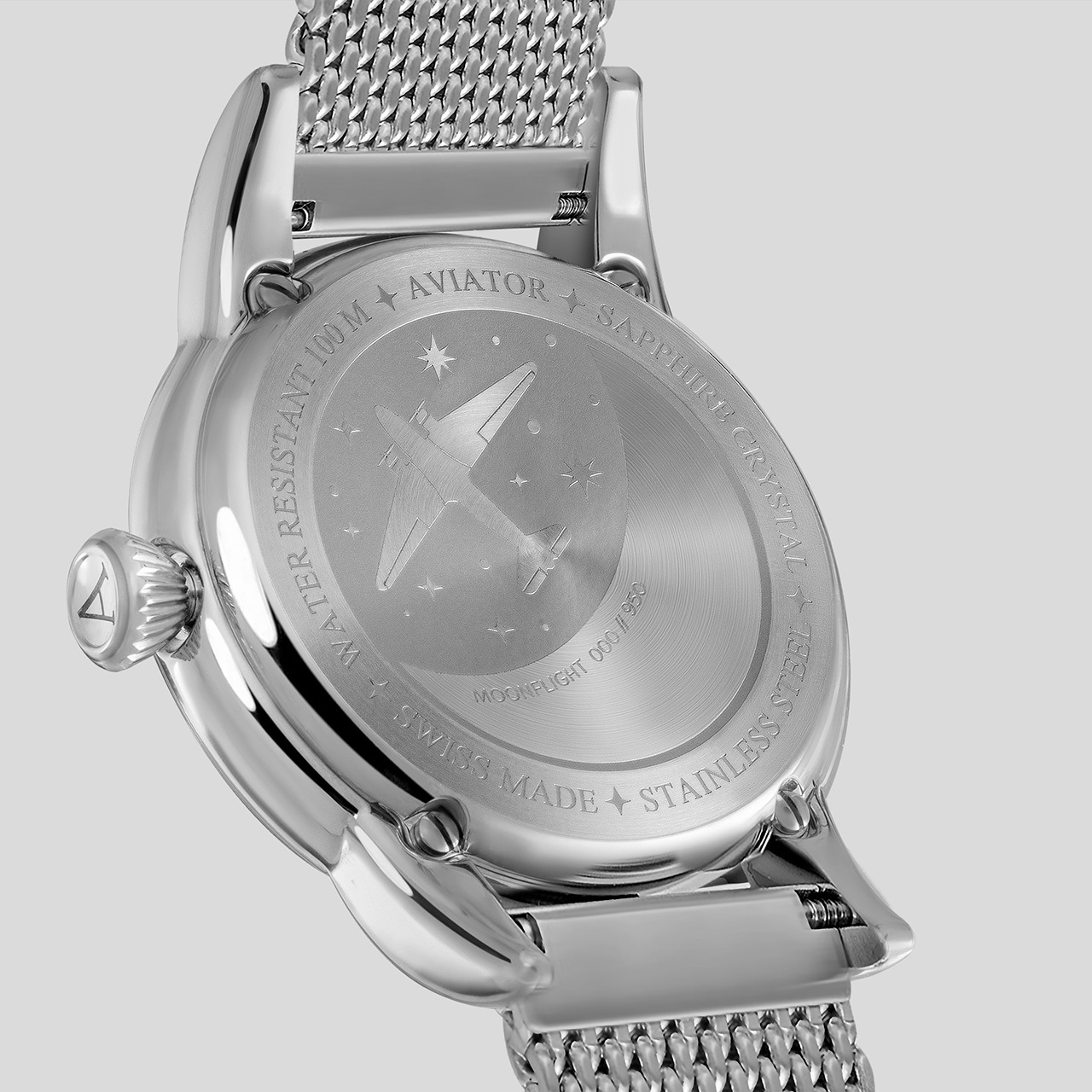 Корпус: Корпус круглой формы выполнен из нержавеющей стали марки 316L. Циферблат светло-зелёного цвета с различными видами финишной обработки. В центральной части стилизация под гильоширование, окруженная шлифовкой в стиле «солнечные лучи». Аппликация часовых индексов и меток-точек. Облака рядом с индикатором фаз Луны с инкрустацией перламутром. Сапфировое стекло с двусторонним антибликовым покрытием имеет повышенную устойчивость к возникновению царапин. Задняя крышка с гравированным изображением авиалайнера Douglas DC-3 имеет винтовое соединение с корпусом. Диаметр 36 мм. Водостойкость 100 метров (10 АТМ).