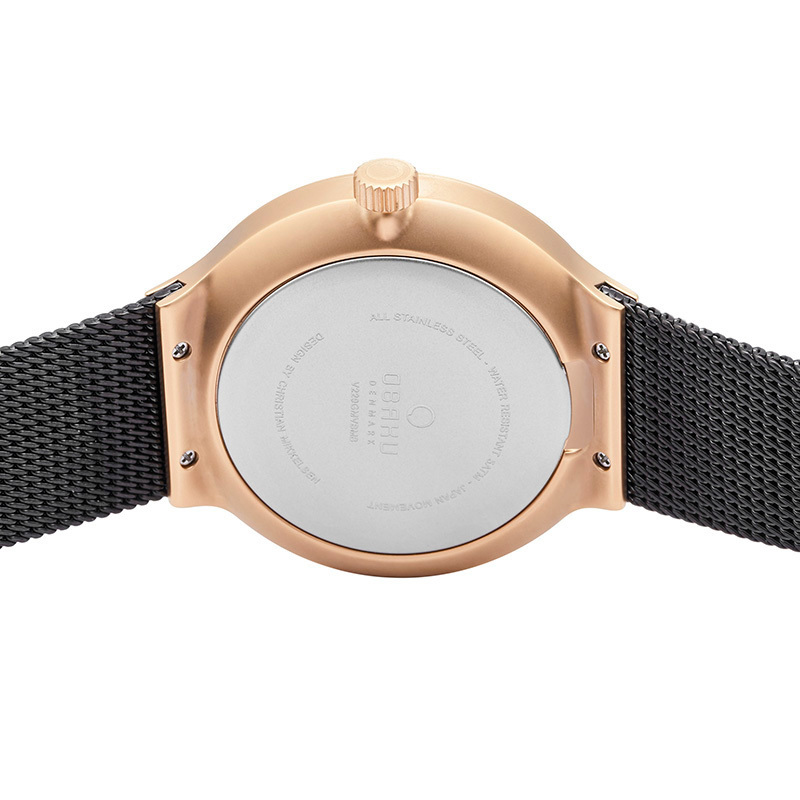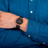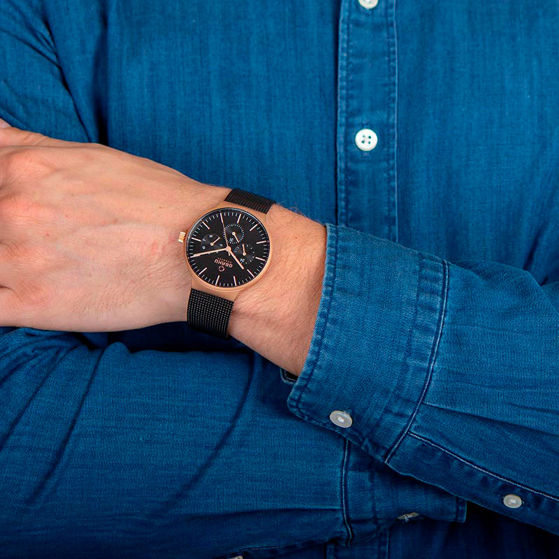 Корпус: Круглый корпус выполнен из матовой нержавеющей стали 316L с IP покрытием цвета розового золота. Чёрный циферблат с золотистыми стрелками. Минеральное стекло. Диаметр 43 мм. Водозащита 30 метров.