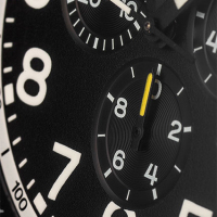 Корпус: Корпус выполнен из нержавеющей высоколегированной стали 316L с матовой обработкой и PVD покрытием черного цвета. Циферблат чёрного цвета, выполнен в стиле «пилот» совмещая элементы ретро и современного дизайна с яркими акцентами. Разметка циферблата и контрастные цифры выполнены методом печати. Стрелки покрыты фотолюминесцентным составом Super-LumiNova и светятся в темноте и при недостаточной освещенности. Окраска вспомогательных стрелок желтым цветом обращаены к приборной панели «Аэрокобры». Сапфировое стекло с антибликовым покрытием имеет повышенную устойчивость к появлению царапин. Диаметр 45 мм. Водозащита 100 метров.