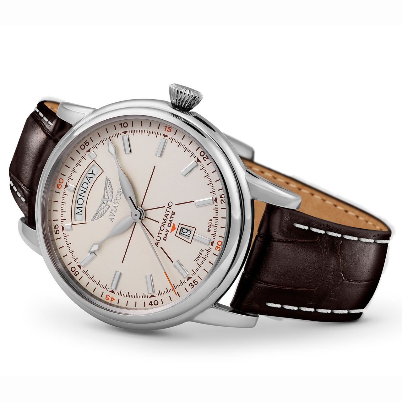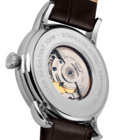 Ремешок: Коричневый ремешок из телячьей кожи с тиснением под аллигатора, контрастная прошивка по краю, ширина 22/20 мм. Браслетная застежка из нержавеющей стали, раскладывающаяся при нажатии кнопок двойной блокировки.