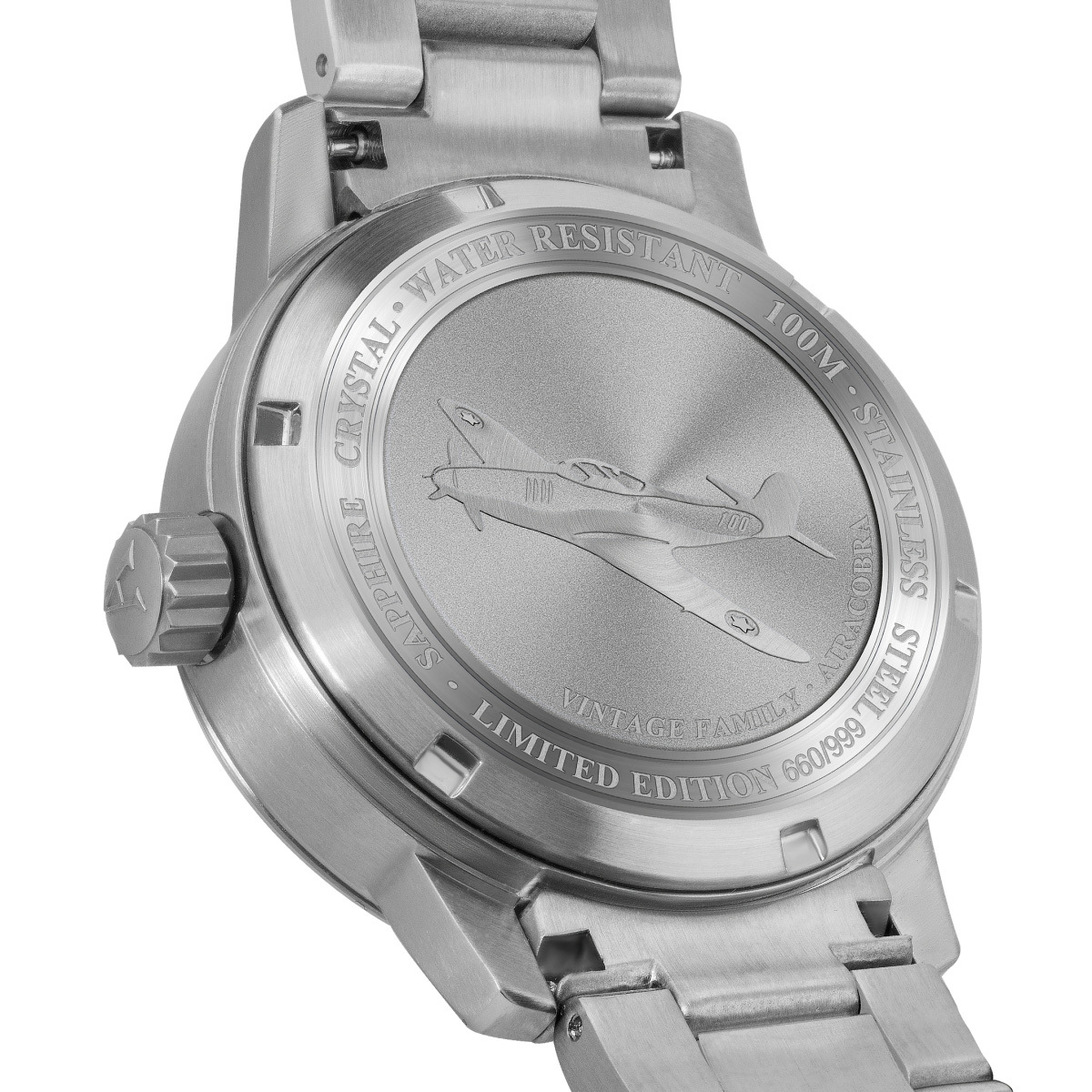 Корпус: Корпус круглой формы выполнен из нержавеющей стали марки 316L. Переводная коронка увеличенного размера для удобства вращения рукой в летной перчатке с гравировкой в виде буквы «A». Циферблат чёрного цвета с шлифовкой “солнечные лучи”. Стрелки и метки с покрытием SuperLuminova. Сапфировое стекло с двусторонним антибликовым покрытием. Диаметр 42 мм. Водозащита 100 метров.
