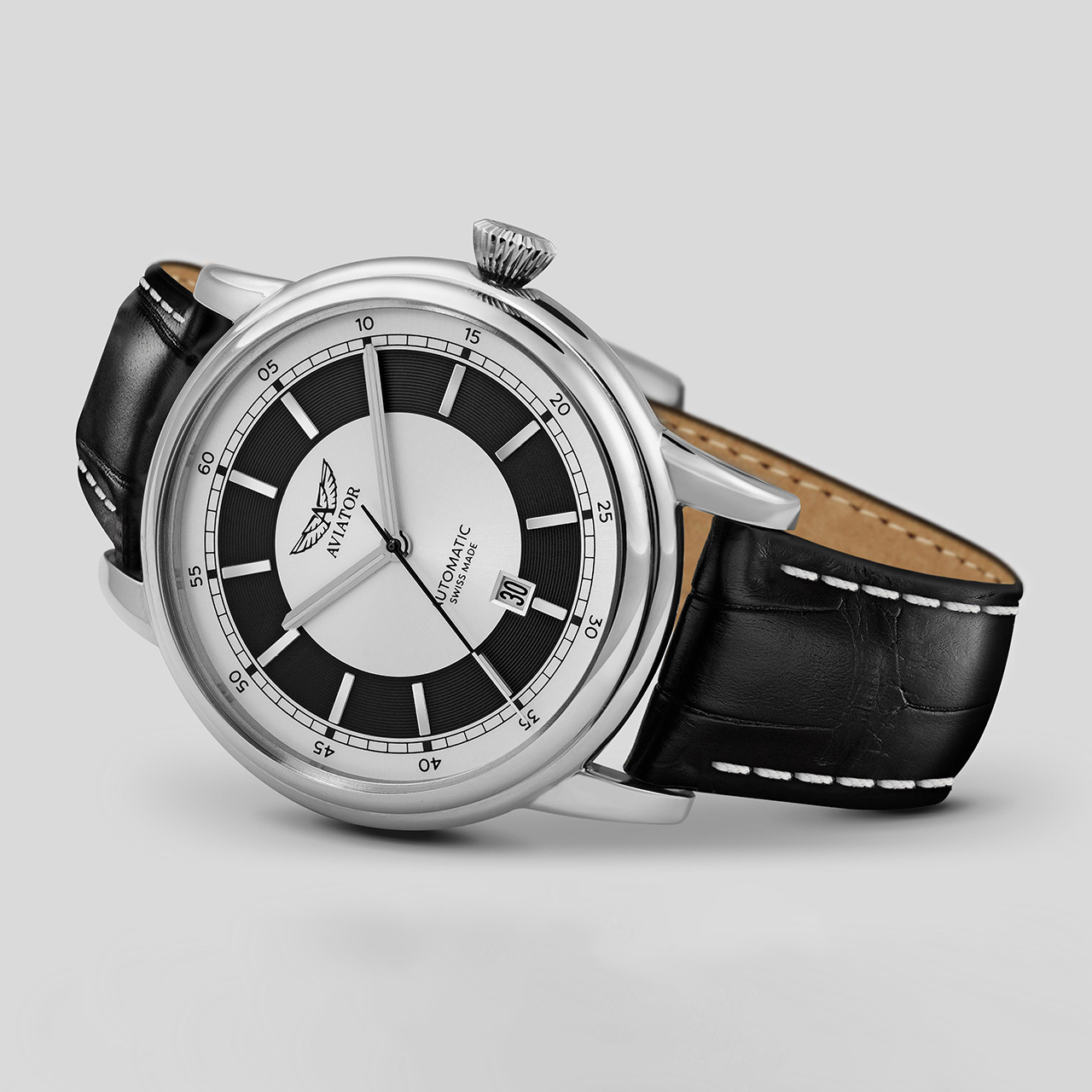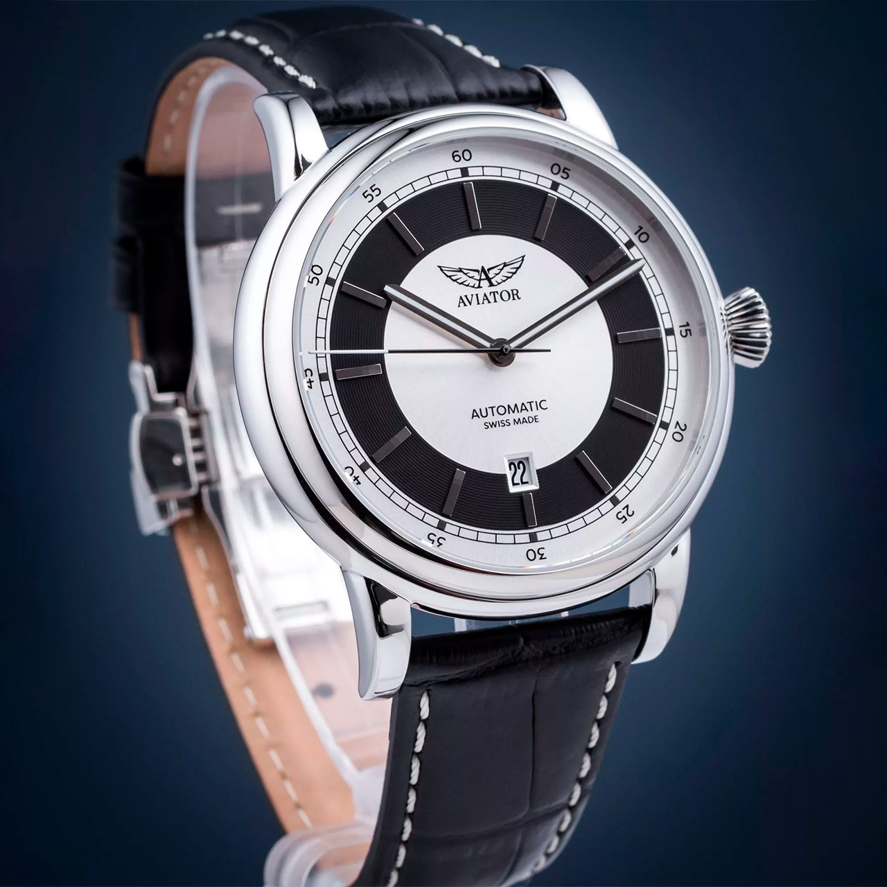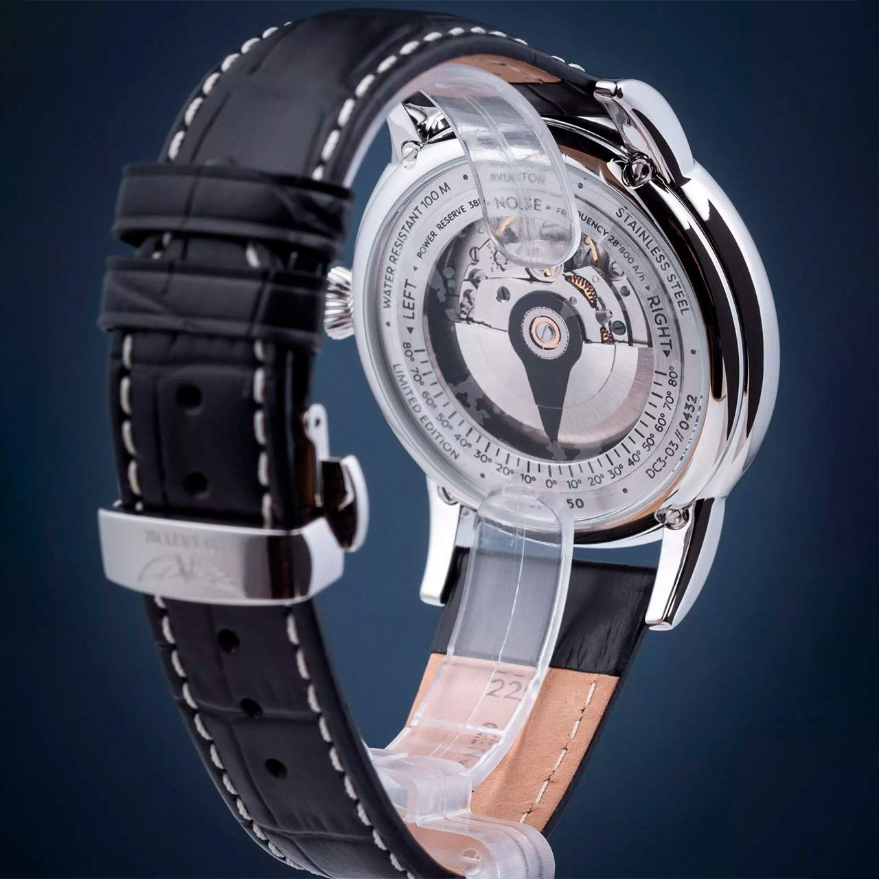 Ремешок: Черный ремешок из телячьей кожи с тиснением под аллигатора. Браслетная застежка из нержавеющей стали, раскладывающаяся при нажатии кнопок двойной блокировки.